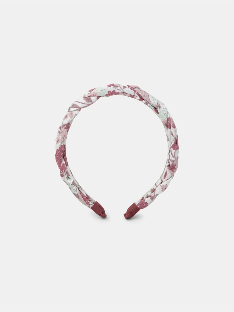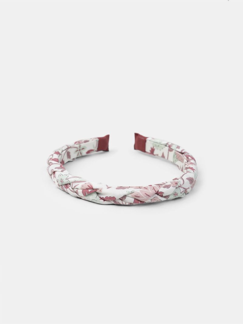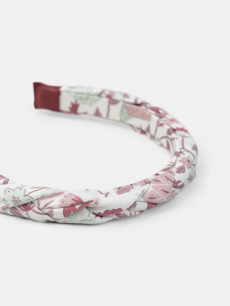 - Диадема, покрита с текстилна материя, която осигурява удобно прилягане и предотвратява всякакъв дискомфорт или дразнене по време на носене в основен цвят екрю с флорален десен в нюанси на розово,цикламено и зелено