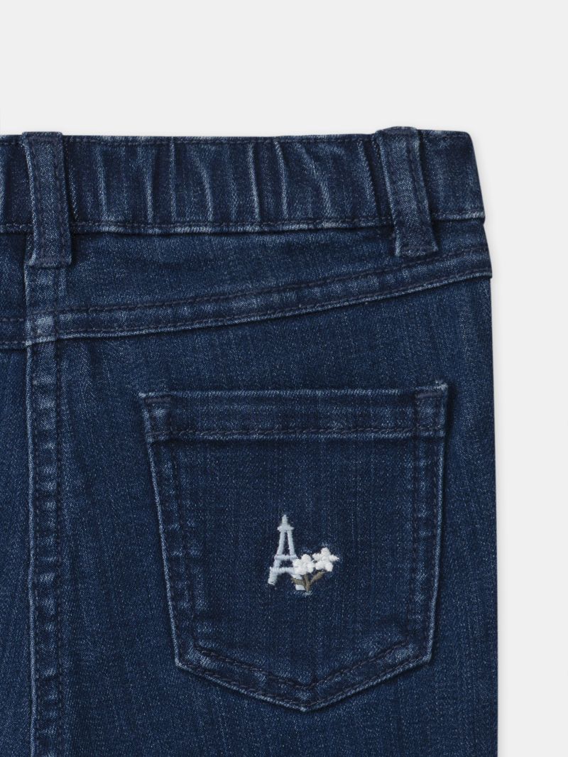 • Еластичен памучен син деним с прилепнала кройка с флорална бродерия