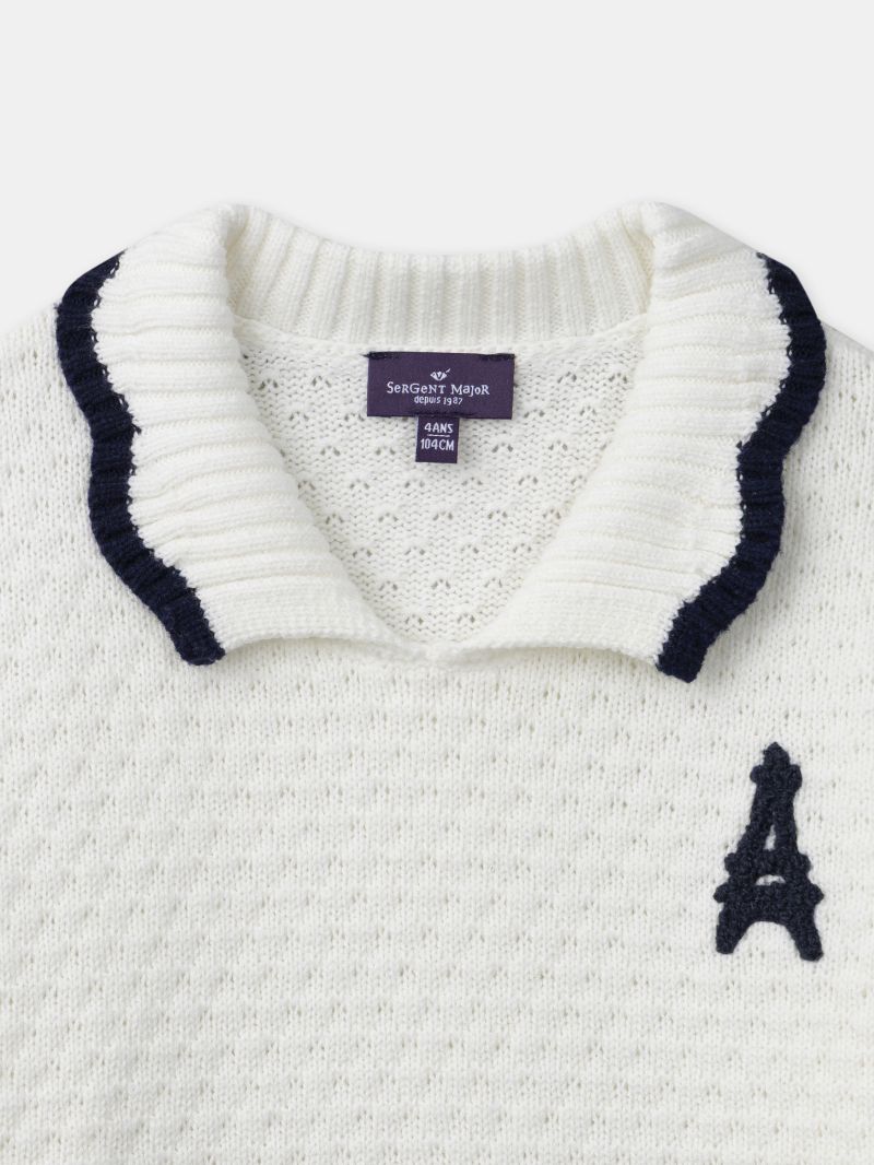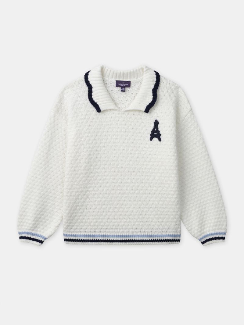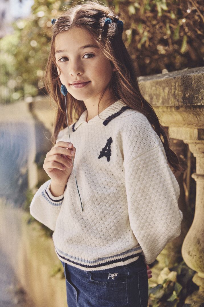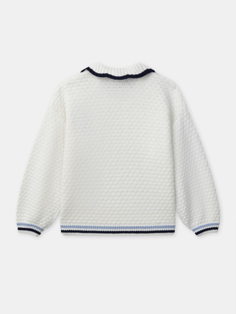 Този пуловер в основен цвят екрю е идеален избор за малките дами, които обичат свежия и стилен вид. Със своите тъмносини кантове, той придава настроение и елегантност на всяко облекло. Яката тип Питър Пан добавя фин и класически акцент, докато рипсените краища в долната част и на ръкавите гарантират комфорт и прецизно прилягане. Идеален за по-хладните дни, този пуловер съчетава топлина и стил.