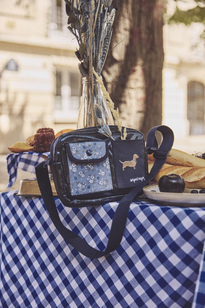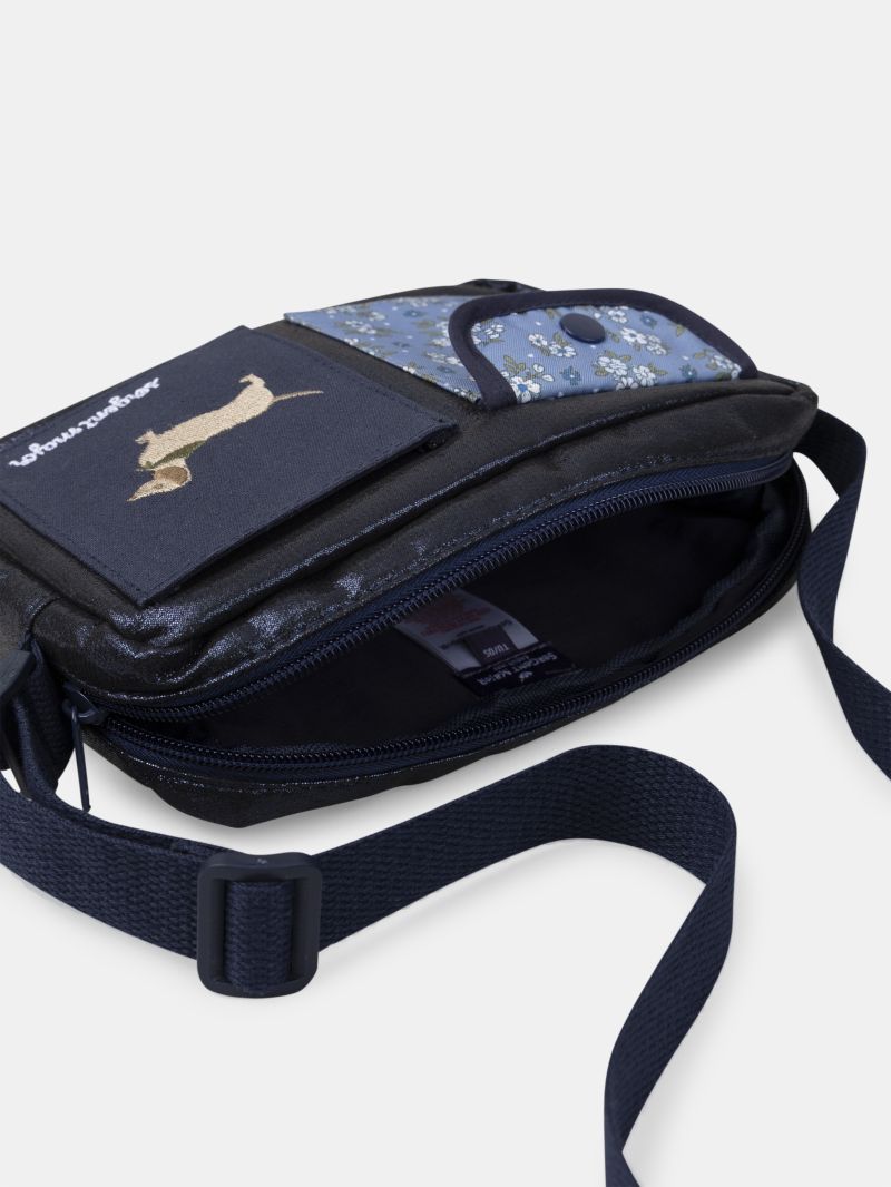 - Чанта в основен тъмносин цвят и джоб с флорален десен