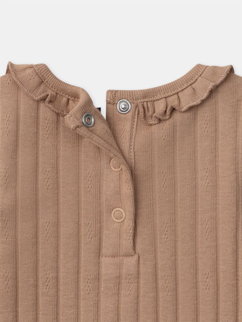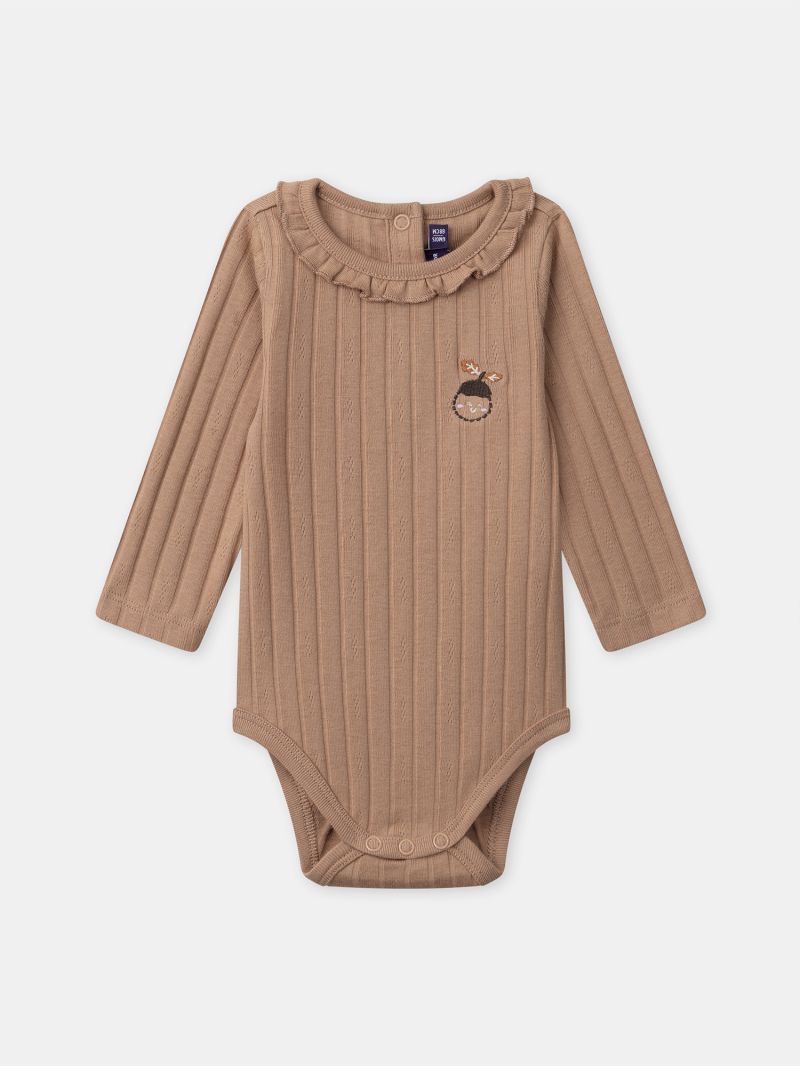 Представяме ви нашето чудесно боди в цвят бежово, предназначено да осигури комфорт на вашето малко съкровище, като същевременно добави изтънченост към тоалета за специално събитие. С елегантна яка дискретна бродерия на гърдите Бодито се откопчава с копчета тик-так на гърба и на дъното, което улеснява обличането.