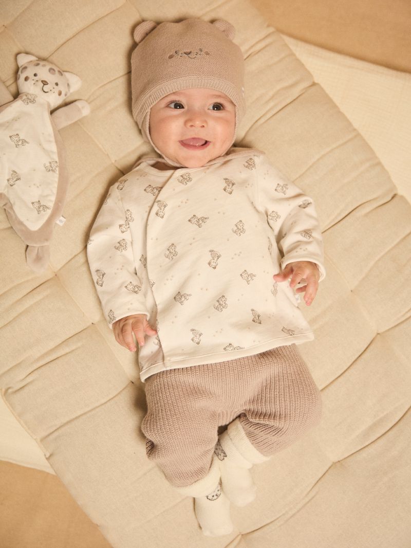 Този изключително красива шапка от плетиво - памук в съчетание с вълна, е необходим аксесоар за запазване на топлината на вашето бебе през първите му месеци.