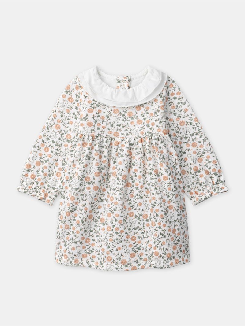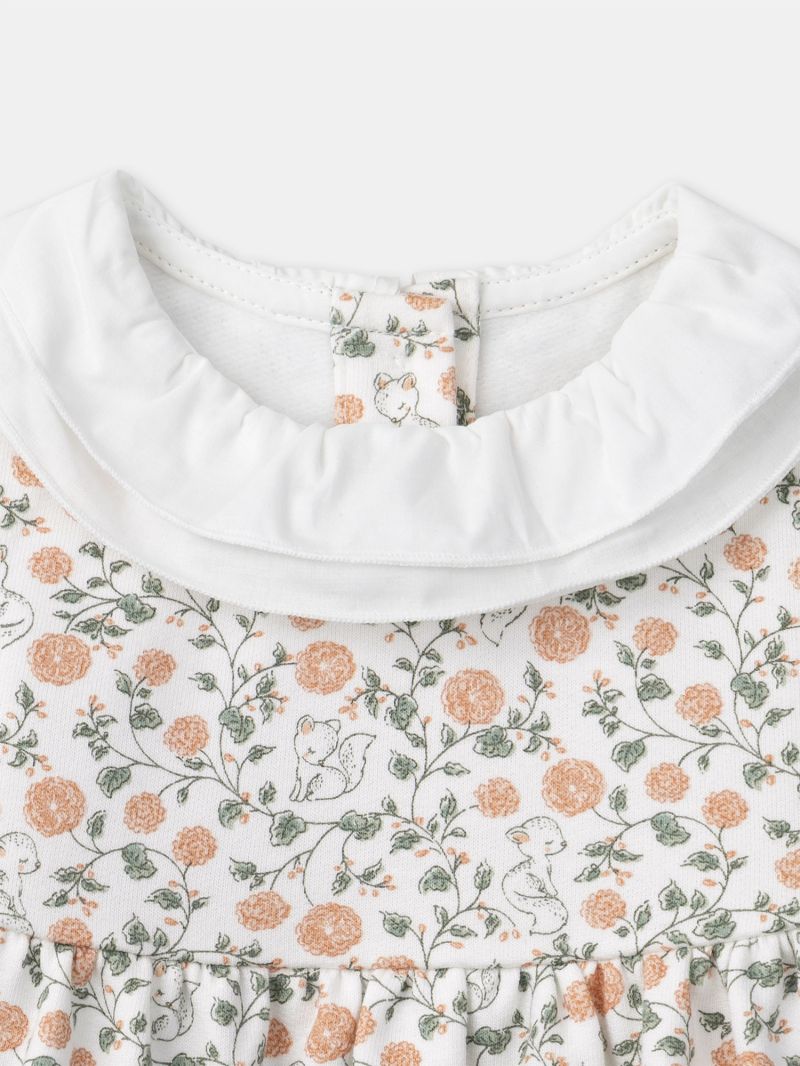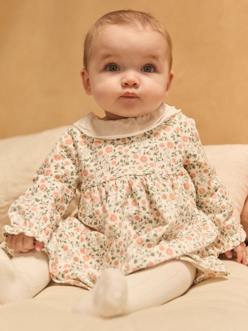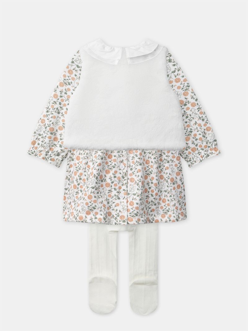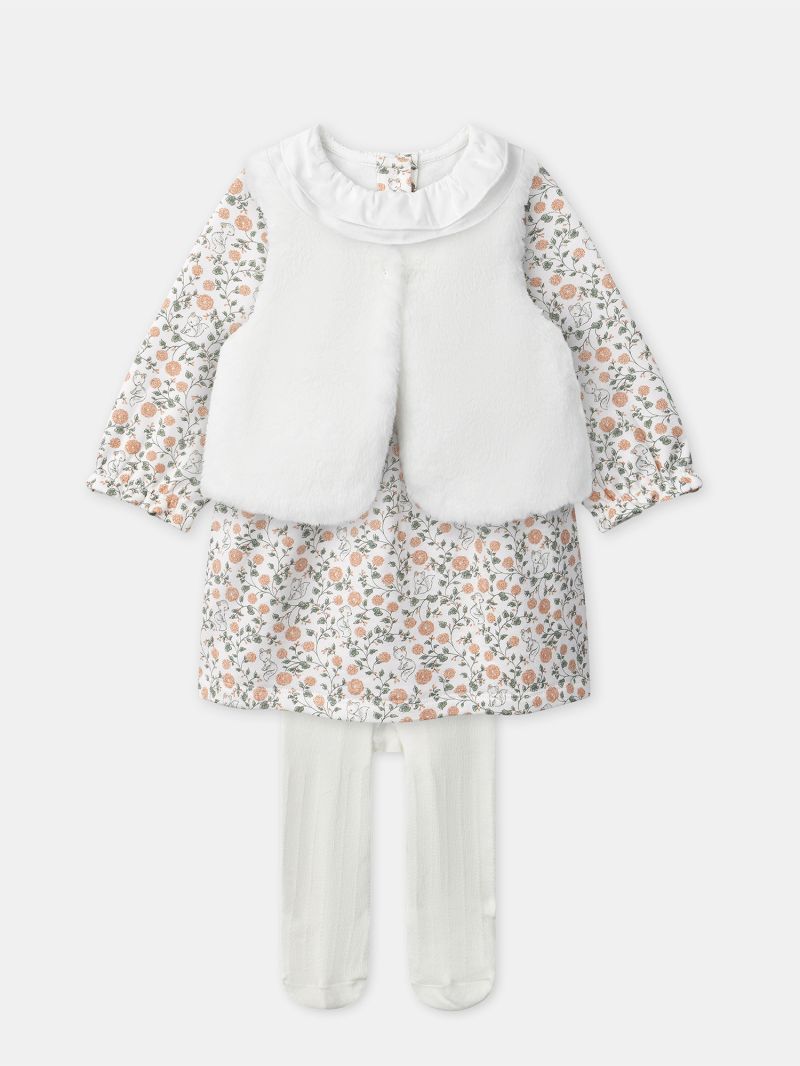 Този елегантен комплект за новородено е перфектен избор за всекидневен комфорт и стил. Рокля в цвят екрю с флорален десен с фина яка добавя нотка на изтънченост. Чорапогащите в екрю цвят осигуряват допълнителен комфорт. Допълнен с меко и топло елече, с памучна подплата с десен, този комплект е както практичен, така и елегантен. Идеален за подарък, комплектът пристига с красива подаръчна каричка в тематичен дизайн.