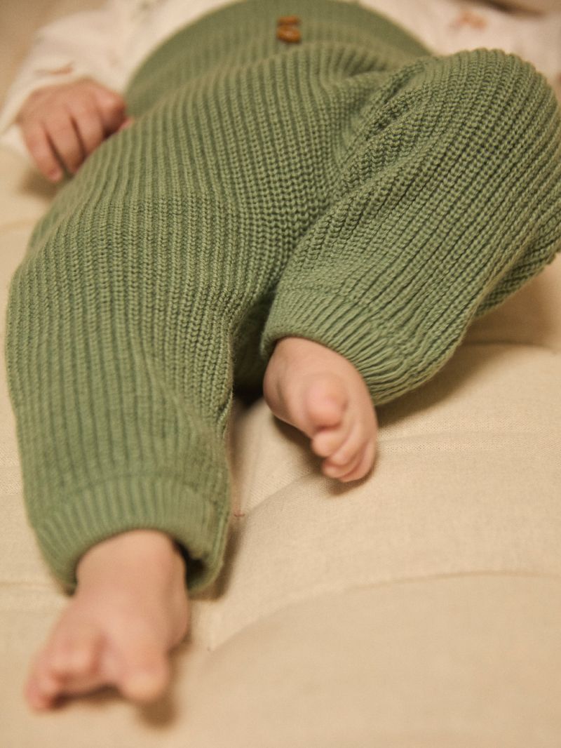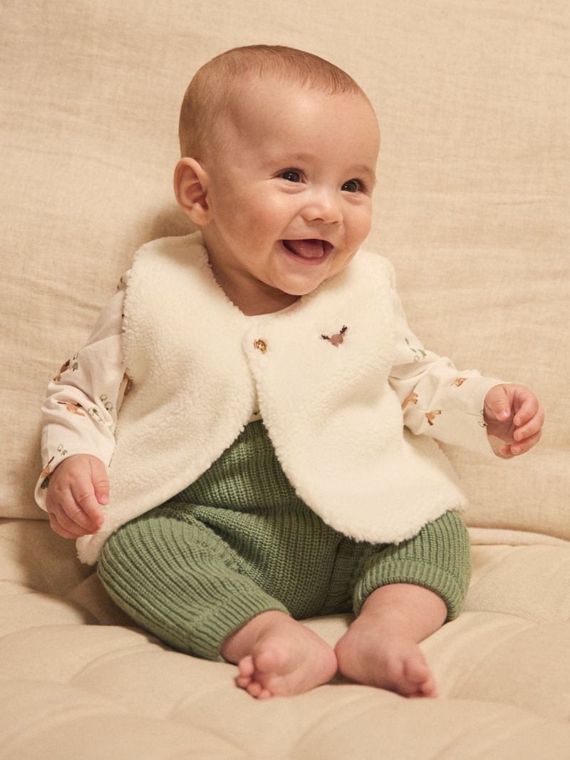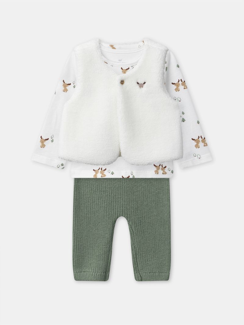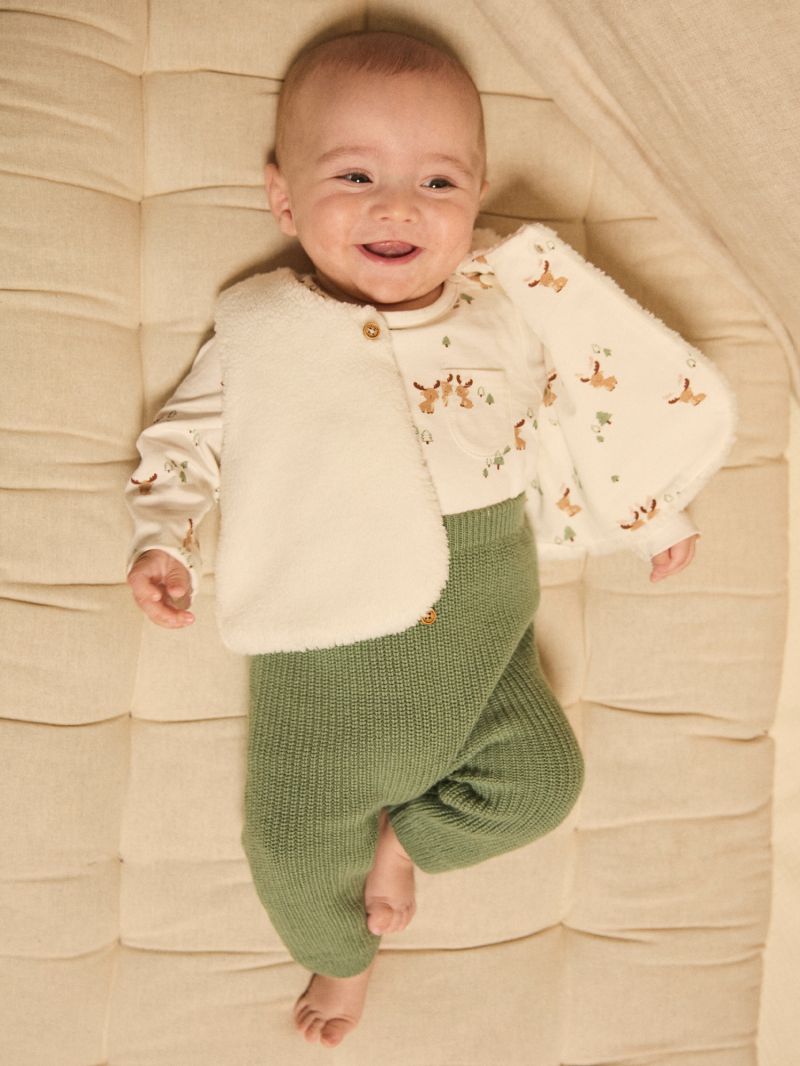 Този комплект за новородено съчетава комфорт и елегантност, идеален за ежедневни моменти. Съдържа топла блузка-боди с дълги ръкави от мек памук в цвят екрю и десен на еленчета. Закопчаване с копчета тик-так в долната част за лесно обличане. Панталонът е от памучно плетиво със съдържание на вълна, в цвят допълващ перфектно горнат част. Рипсеният ластик на кръста и краищата на крачоли, придават на аутфита удобство и стил. Перфектно допълнен с пухкаво елече, който завършва визията с весел Този комплект е перфектен избор за специален подарък за новородено.