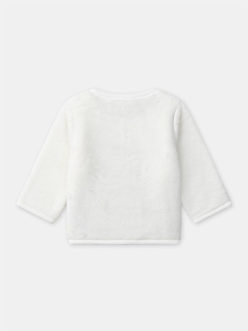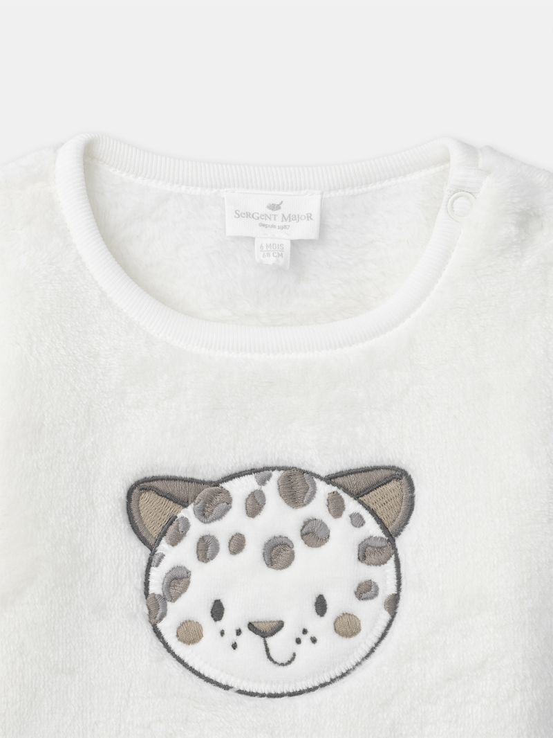 Представяме ви топъл и удобен комплект, който се отличава с пухкаво горнище със забавен мотив с глава леопард в съчетание с панталон в основен екрю цвят.