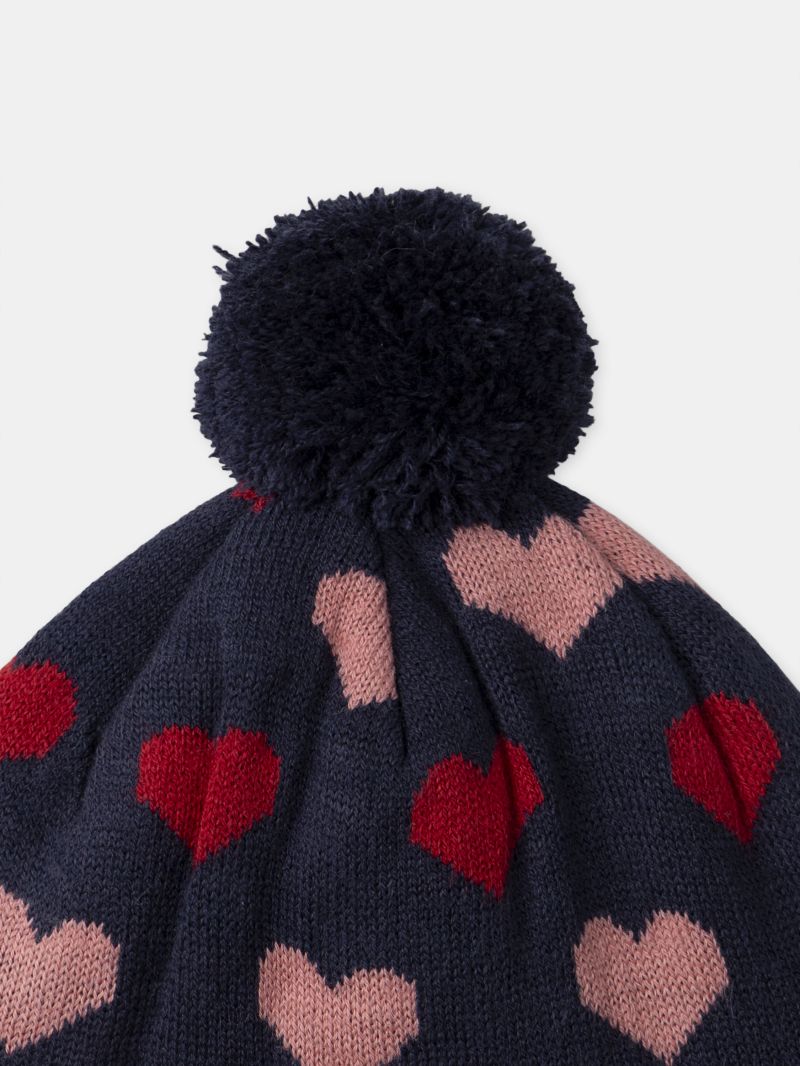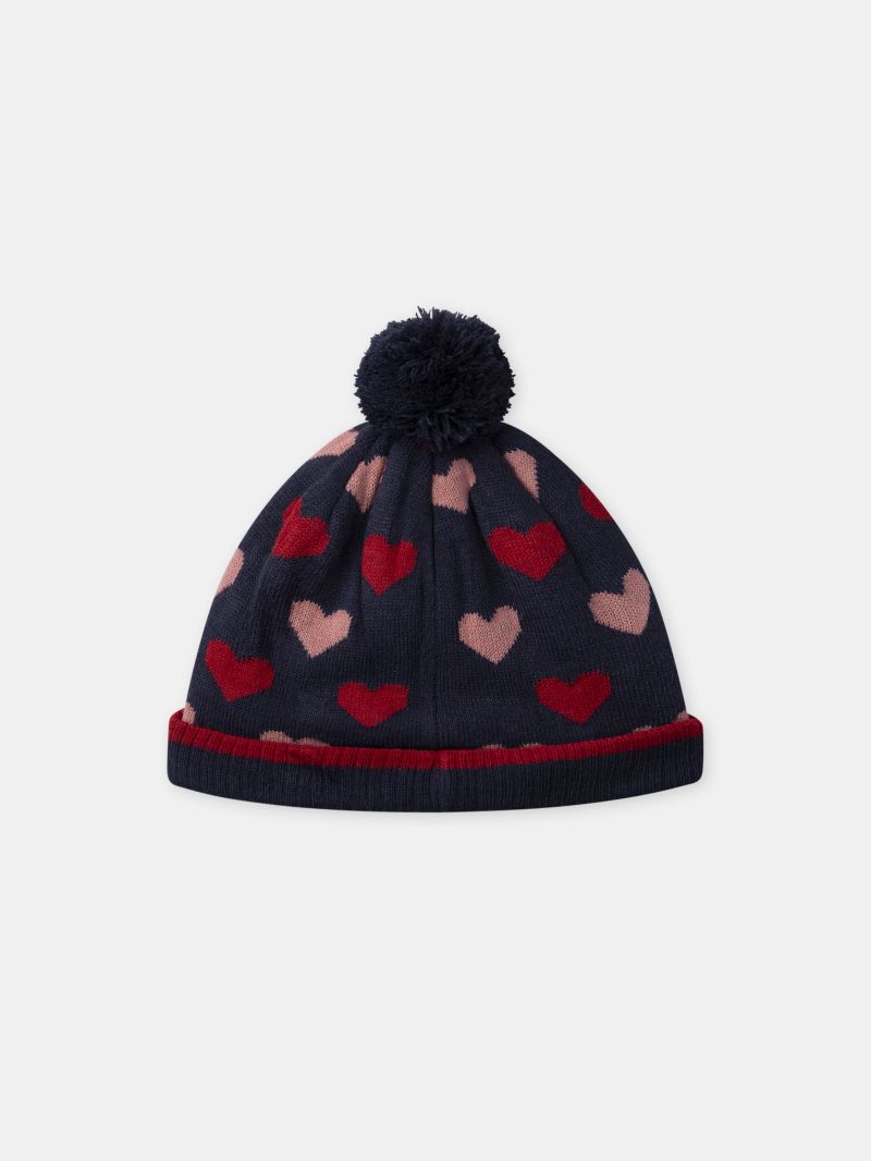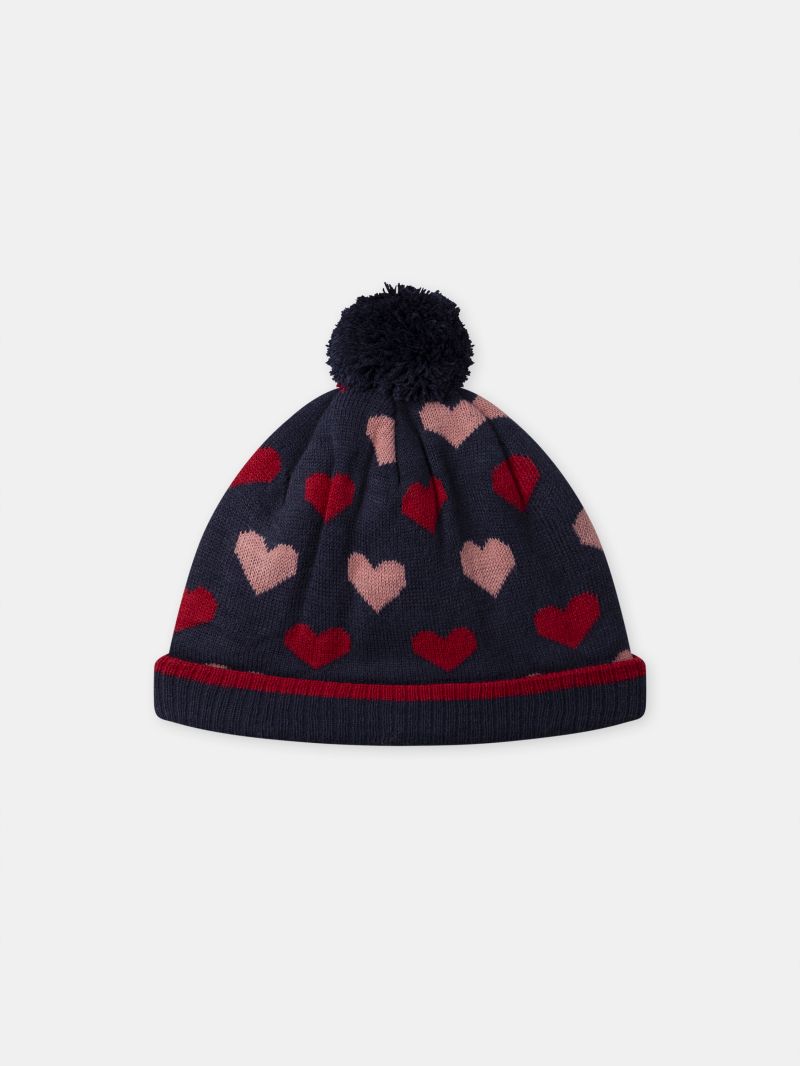 - Шапка от мека прежда в основен цвят тъмносин с десен на сърчица и подплата, която ще поддържа комфорт и топлина по време на студените дни