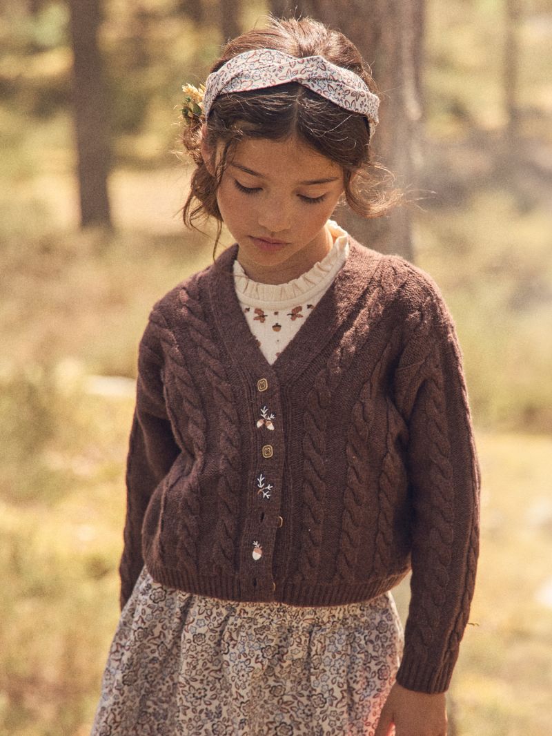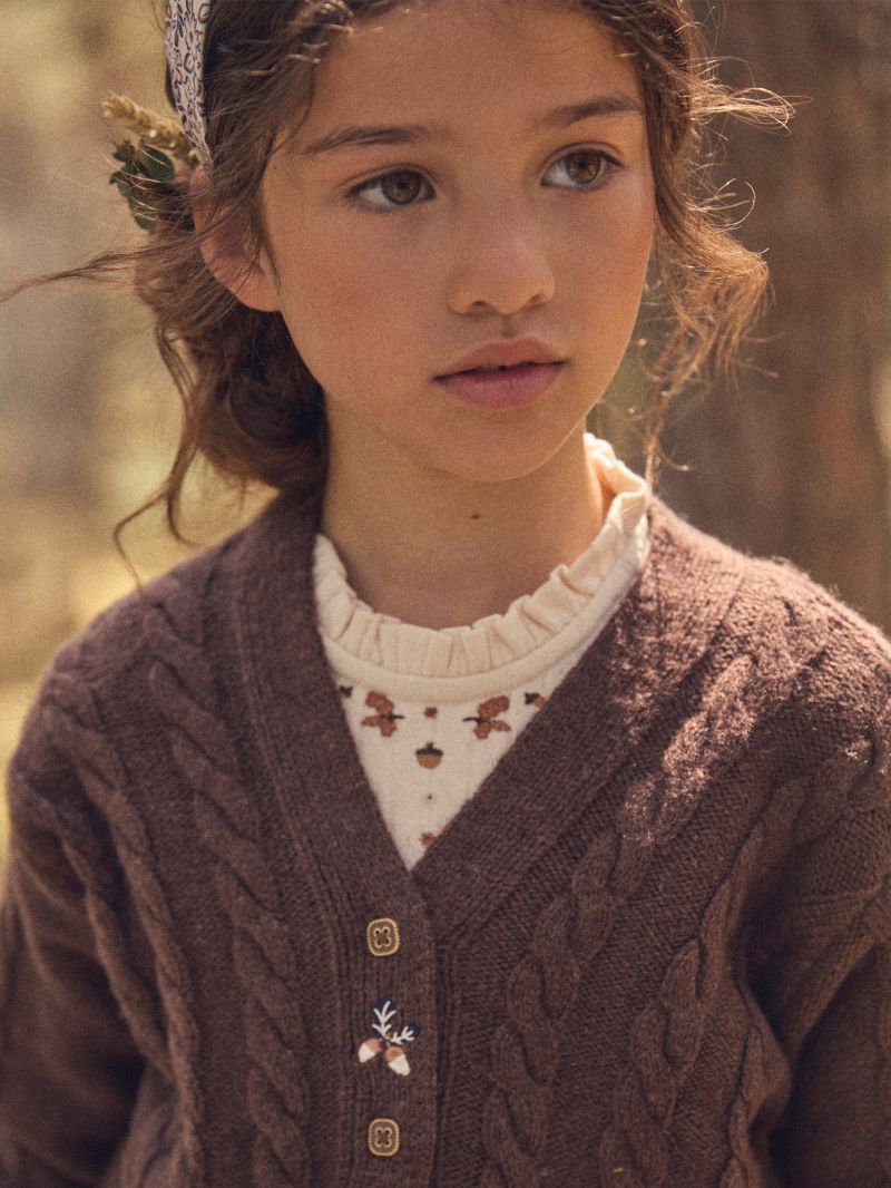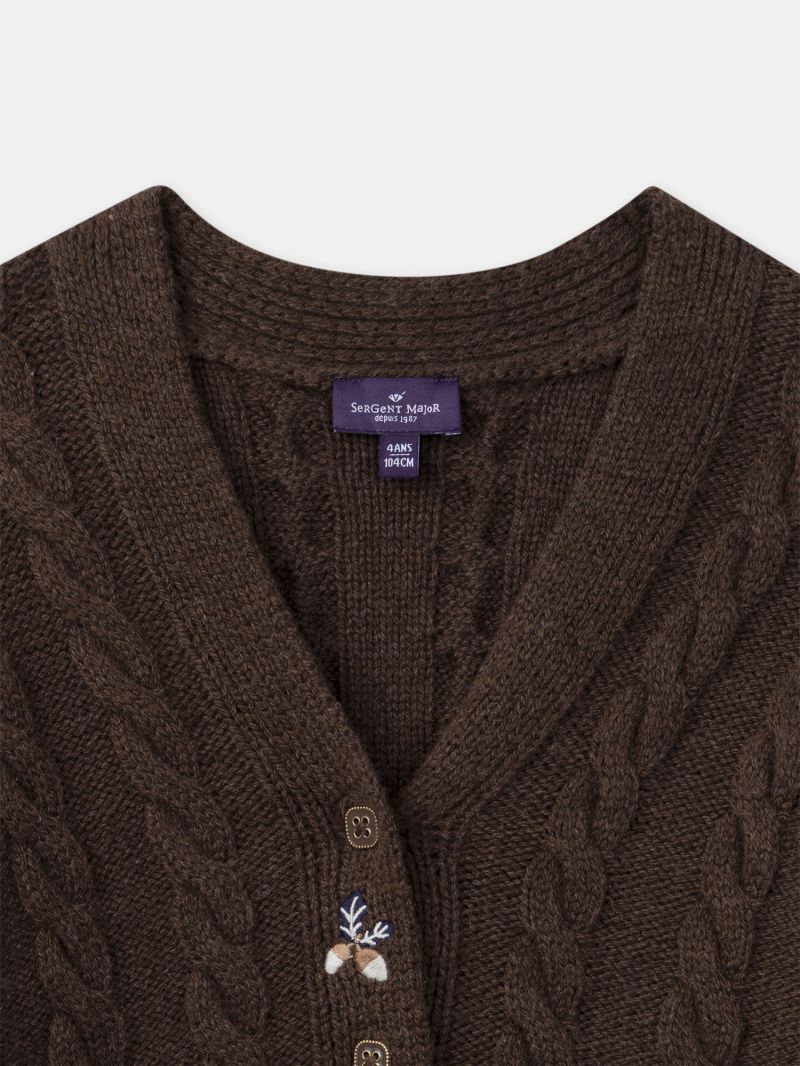 Тази кафява жилетка добавя елегантна нотка към всяко облекло. С бродерии по дължината отпред , тя придава изискан вид на всяка визия. Рипсените краища на деколтето, ръкавите и долната част на дрехата осигуряват удобно прилягане и практичност, което я прави подходяща както за специални поводи, така и за ежедневието.