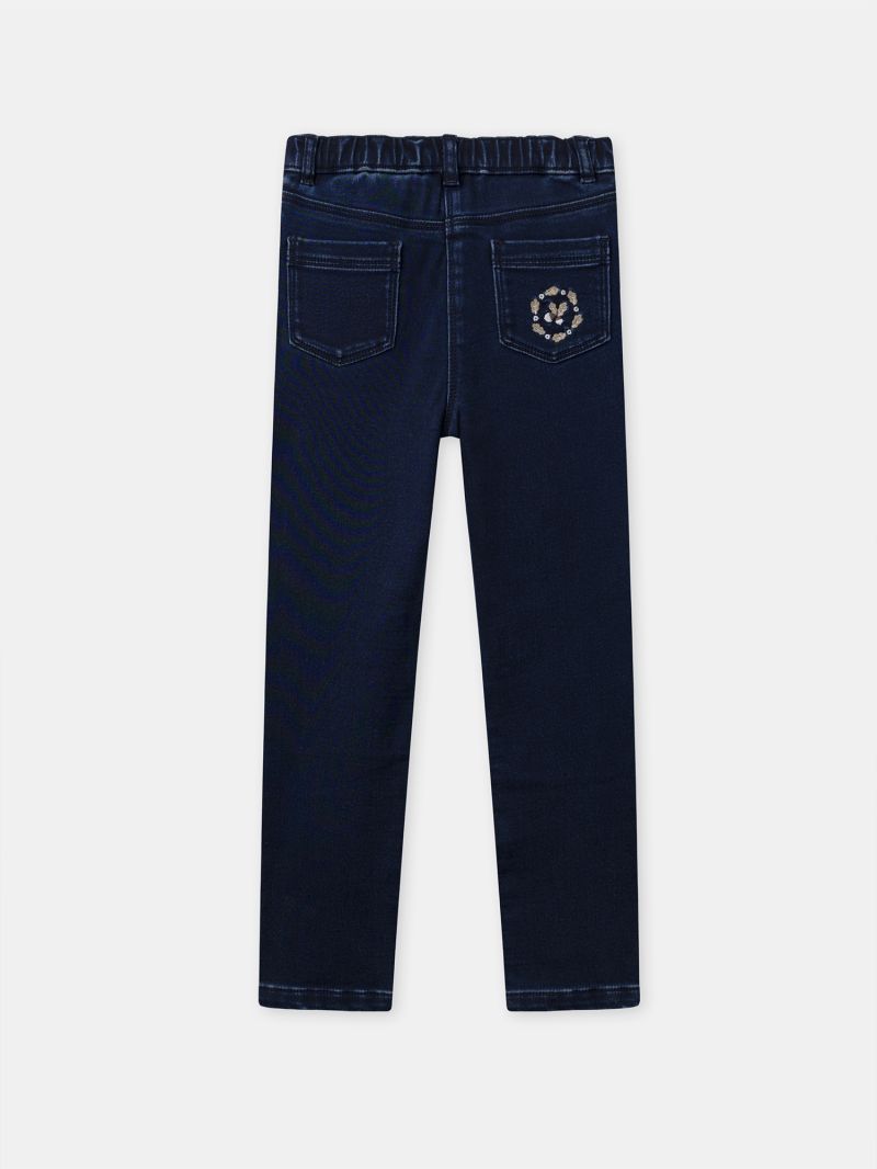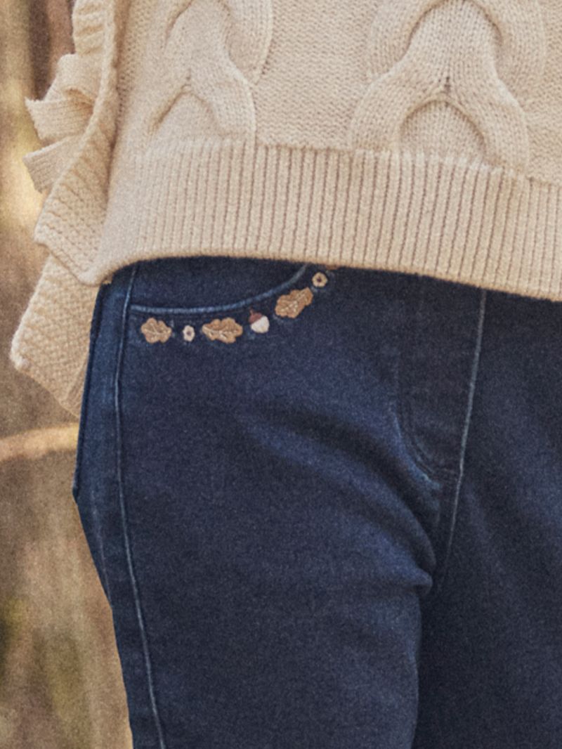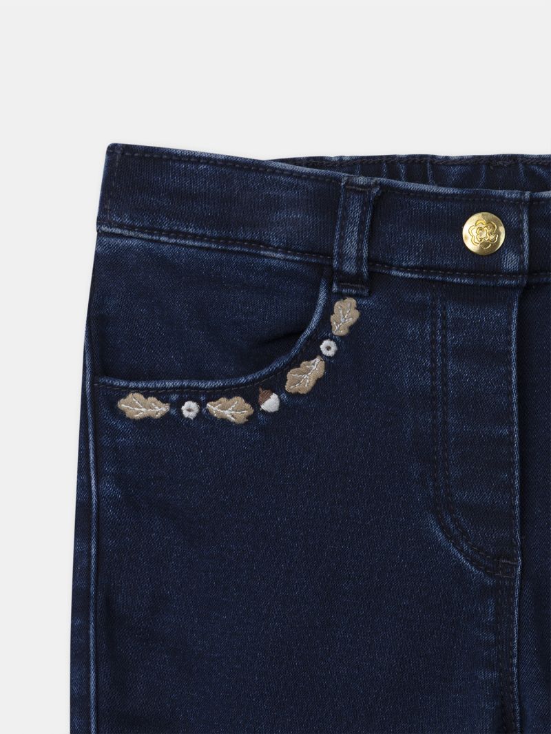 - Еластичен памучен син деним с прилепнала кройка с флорална бродерия