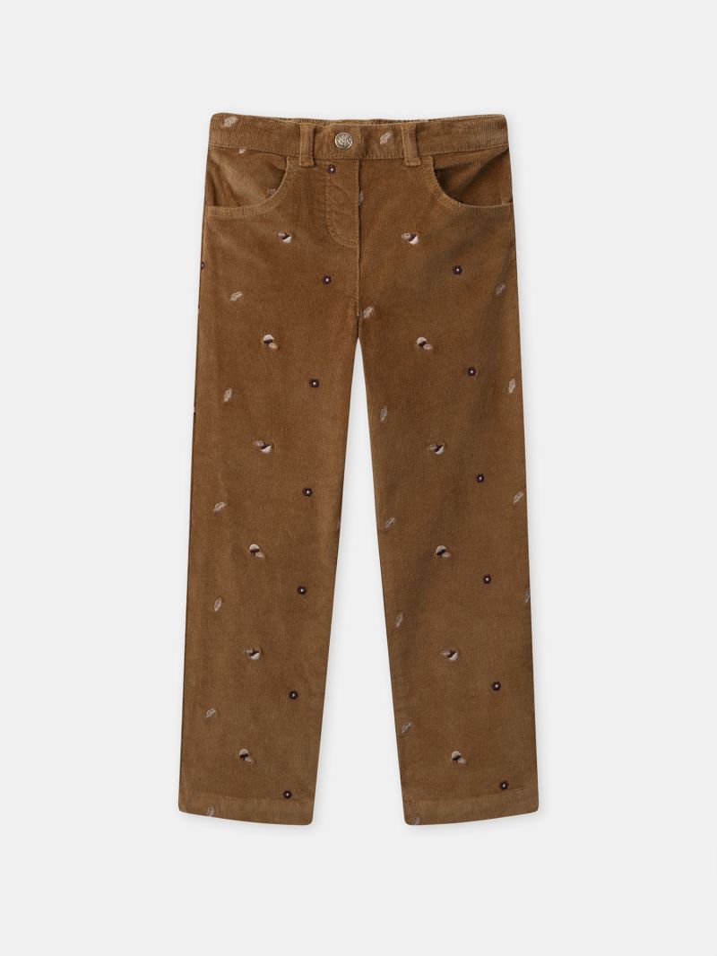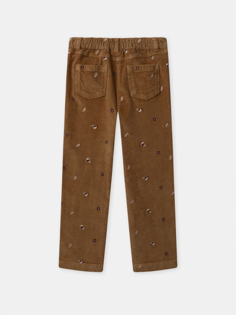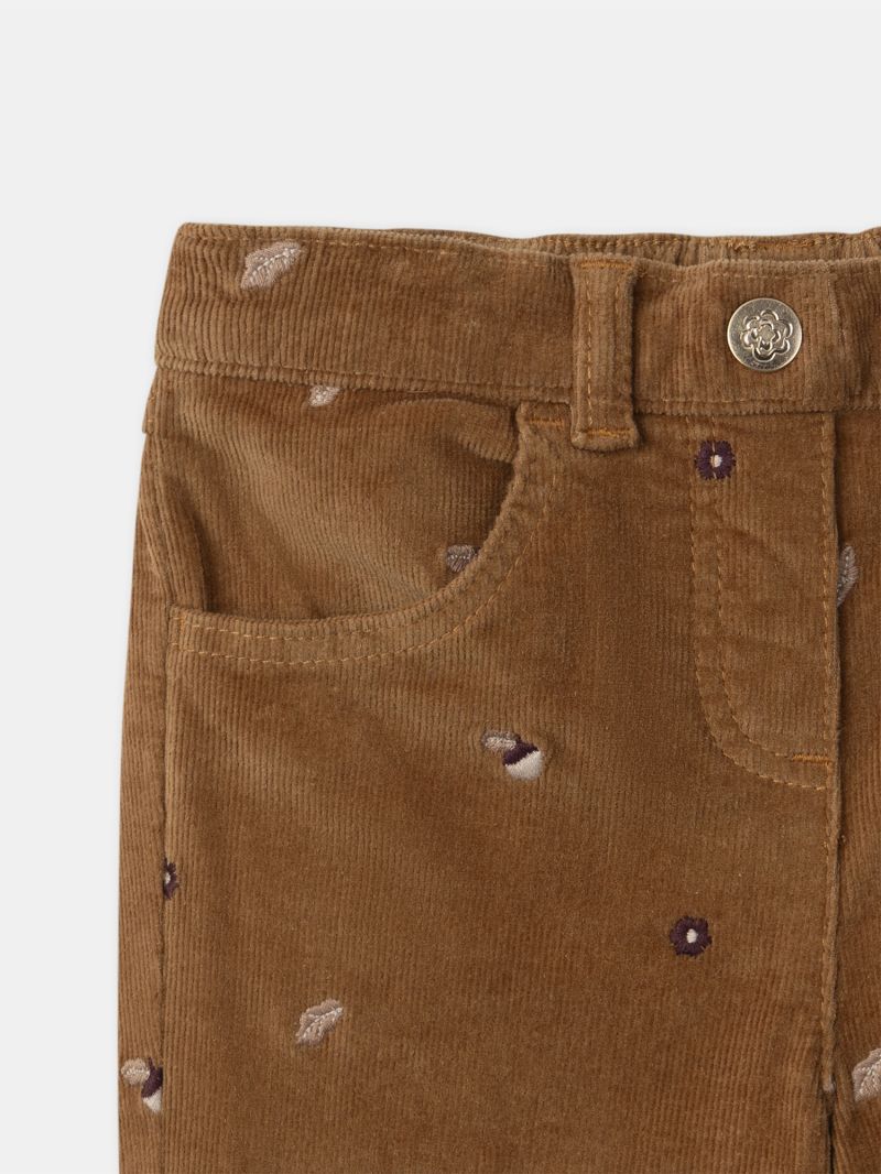 Тези панталон от ситно рипсено кадифе в кафяв цвят с модерен силует се откроява с десена на есенни листа и отворени джобове.