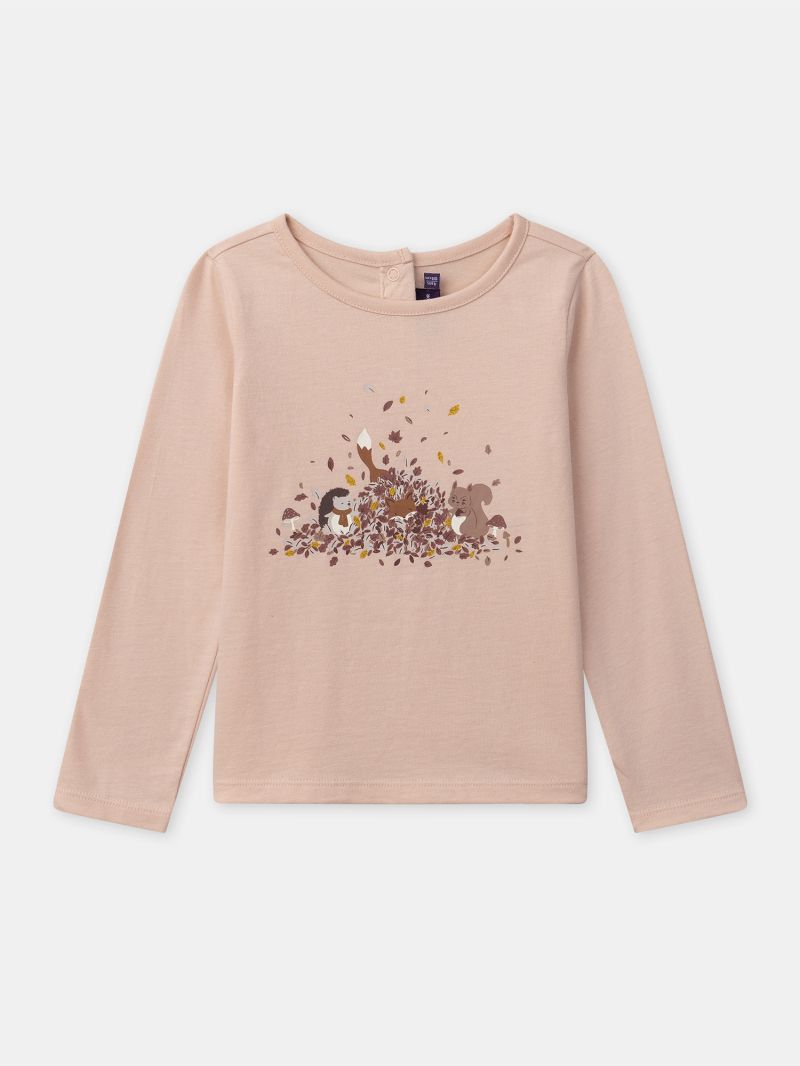 Блуза от памук за момиченце, с ефектен дизайн. Тя се отличава с есенни мотиви, които придават нотка магия на всяко облекло. Може да съчетаете с панталон или с пола за по-елегантна визия.