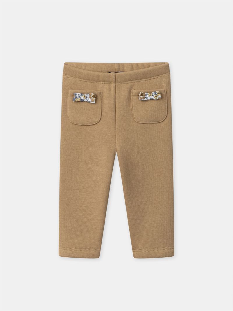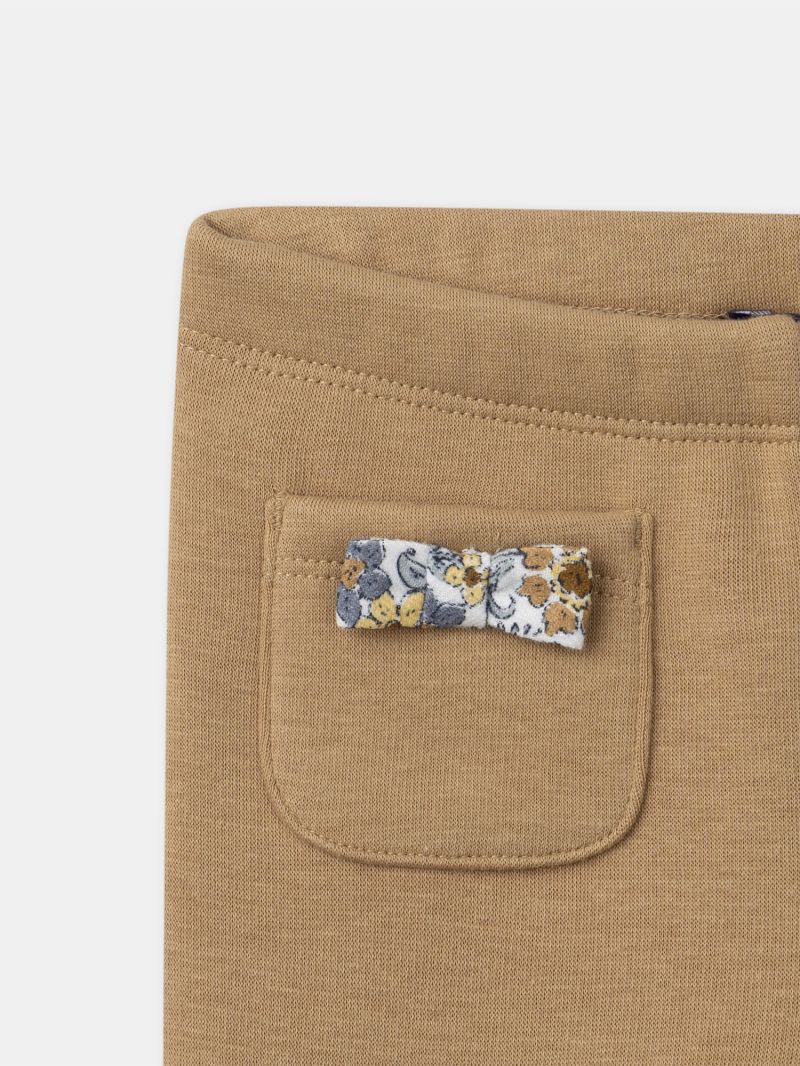Идеален за активните дни на вашето малко съкровище, тези елегантен клин предлагат съвършен баланс между комфорт и стил. С нежни декоративни панделки от кепър с флорален десен на двата джоба, които добавят деликатна и цветна нотка към всяка визия. Еластичната талия гарантира отлично прилягане и свобода на движение, правейки го идеален избор за всяко приключение с удобство и изисканост.