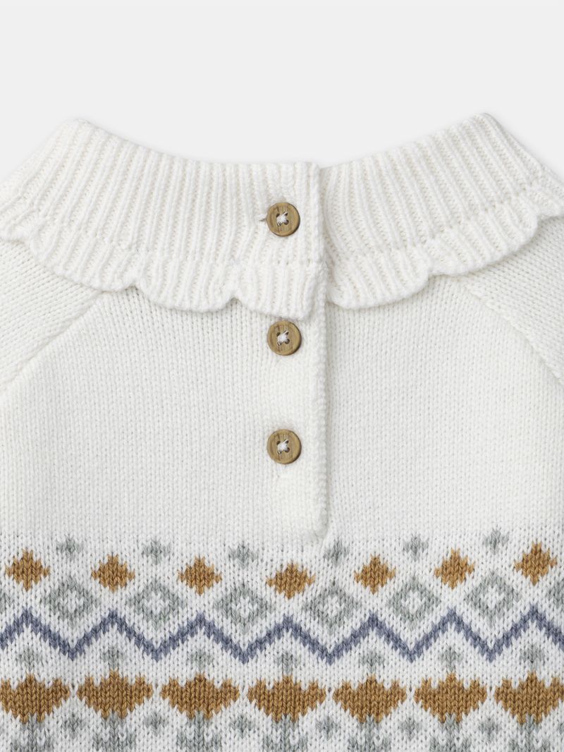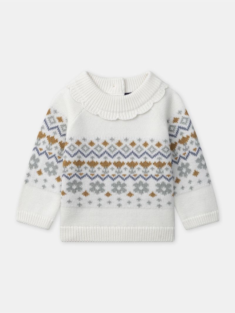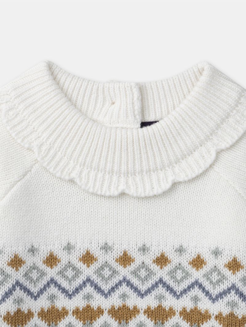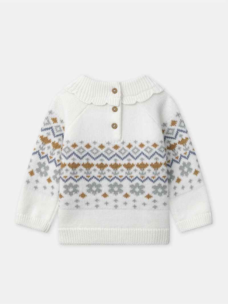 Този пуловер в основен цвят екрю с десен е мек и елегантен, превръщайки се в задължителен елемент за гардероба на всяко момиченце. С рипсени краища на ръкавите, деколтето и долната част, той осигурява удобно и плътно прилягане. Перфектен избор за съчетаване на комфорт и елегантност.