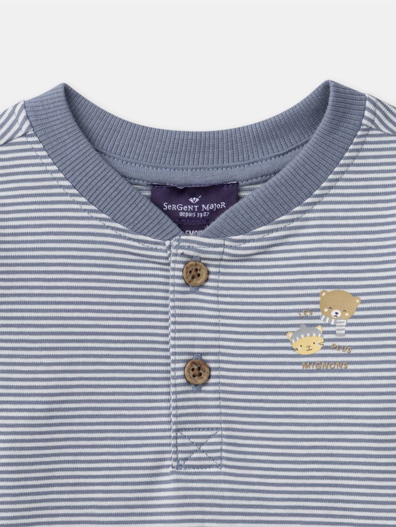 Тази лека и удобна блуза е незаменима част от есенно-зимния гардероб на вашето малко момче. Десенът на райе добавя нотка свежест и жизненост, докато мотививите на меченце добавят закачлива нотка. Откопчаването с копчета от естествено дърво отпред улеснява обличането, предлагайки практичност и комфорт на родителите и детето.