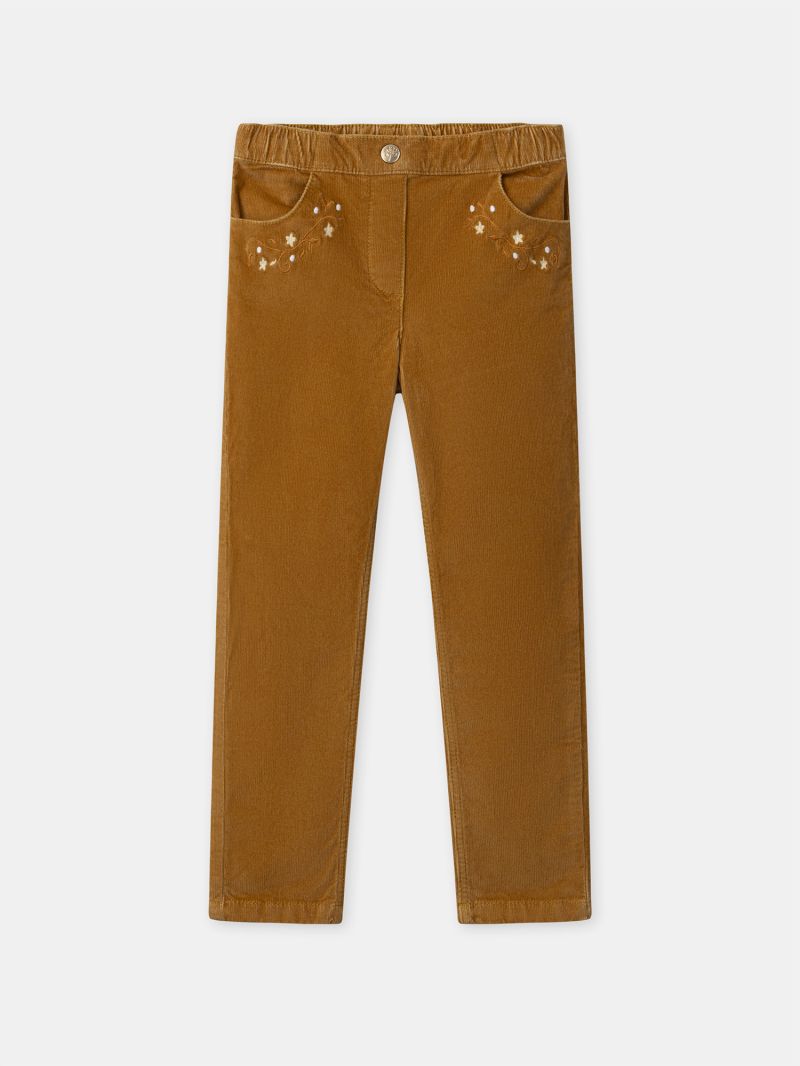 Тези панталон от ситно рипсено кадифе в кафяв цвят с модерен силует се откроява с елегантни бродерии на цветя и отворени джобове.
