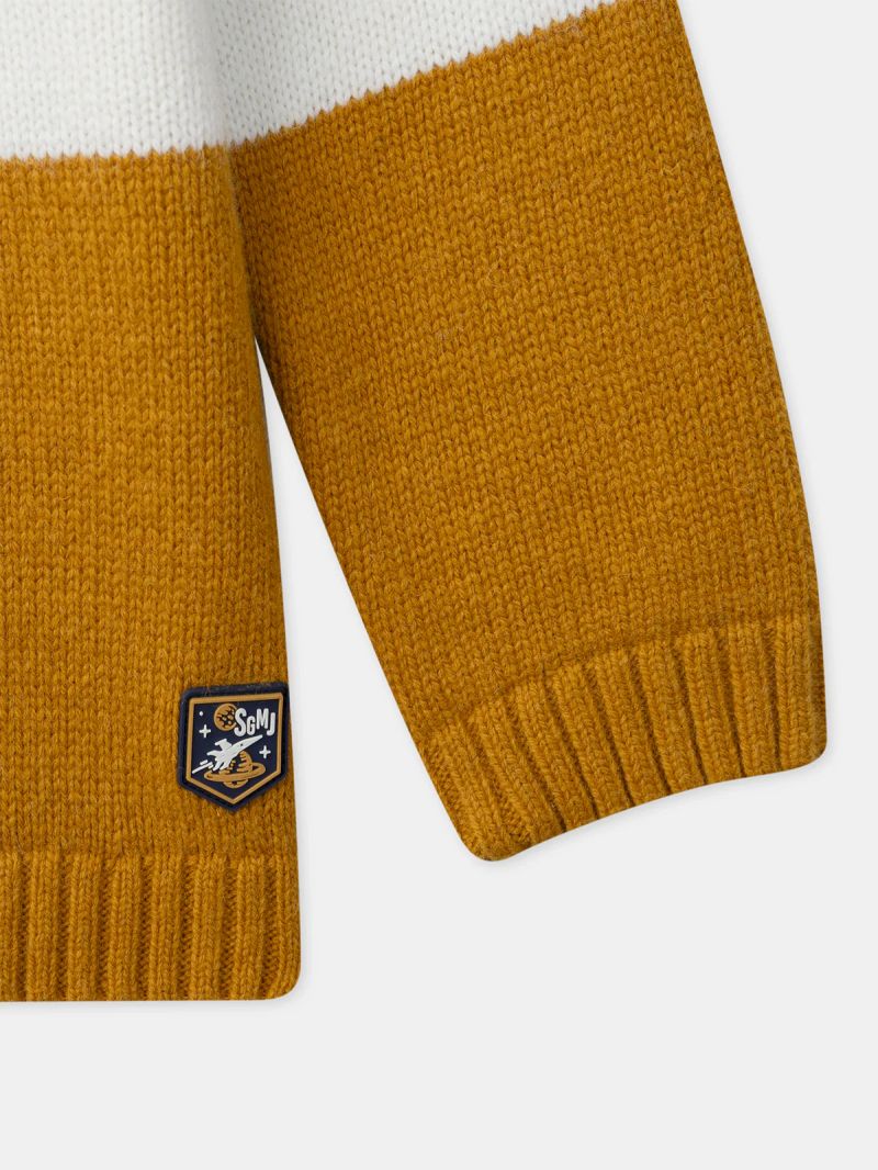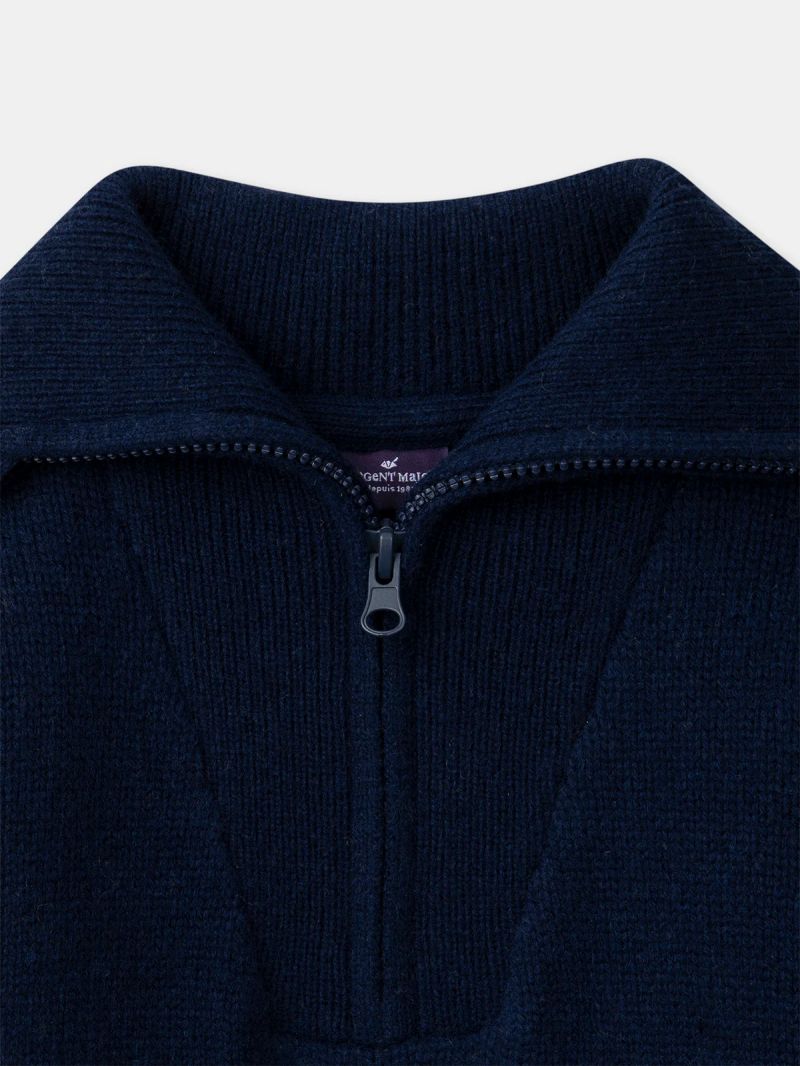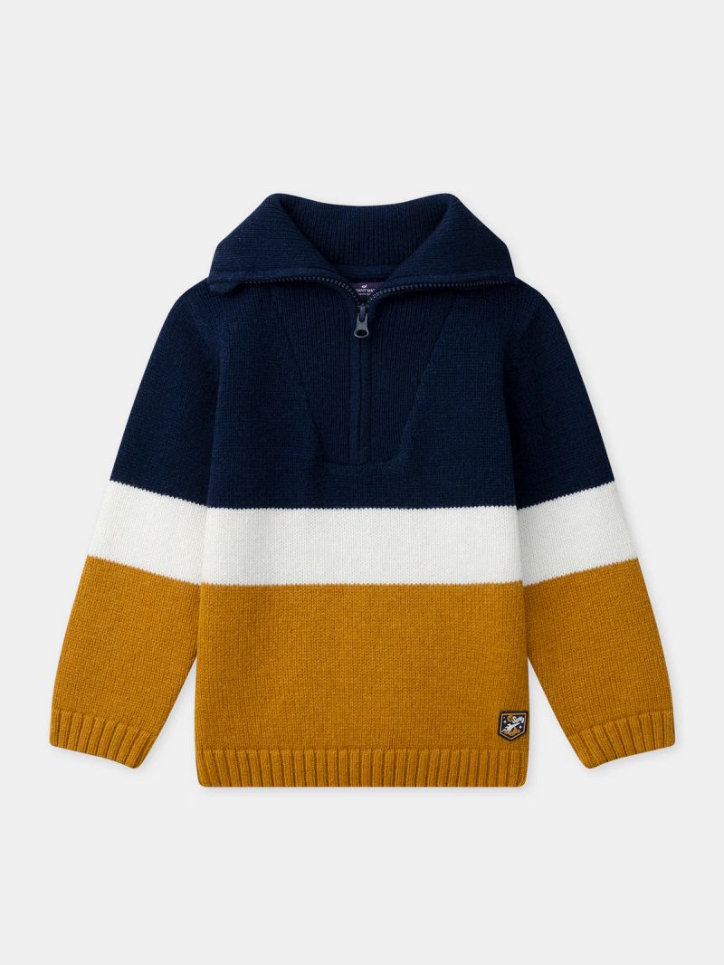 • Идеален избор за студените дни, този трицветен пуловер с половин цип съчетава тъмносиньо, бяло и охра за модерен и уютен вид.