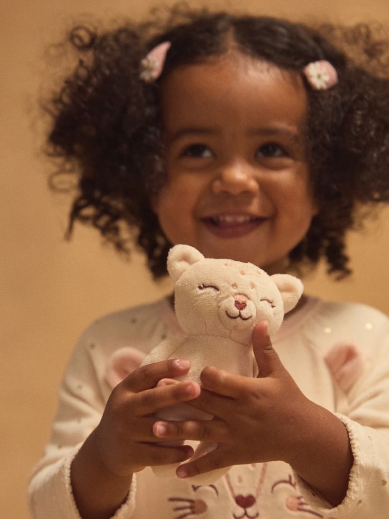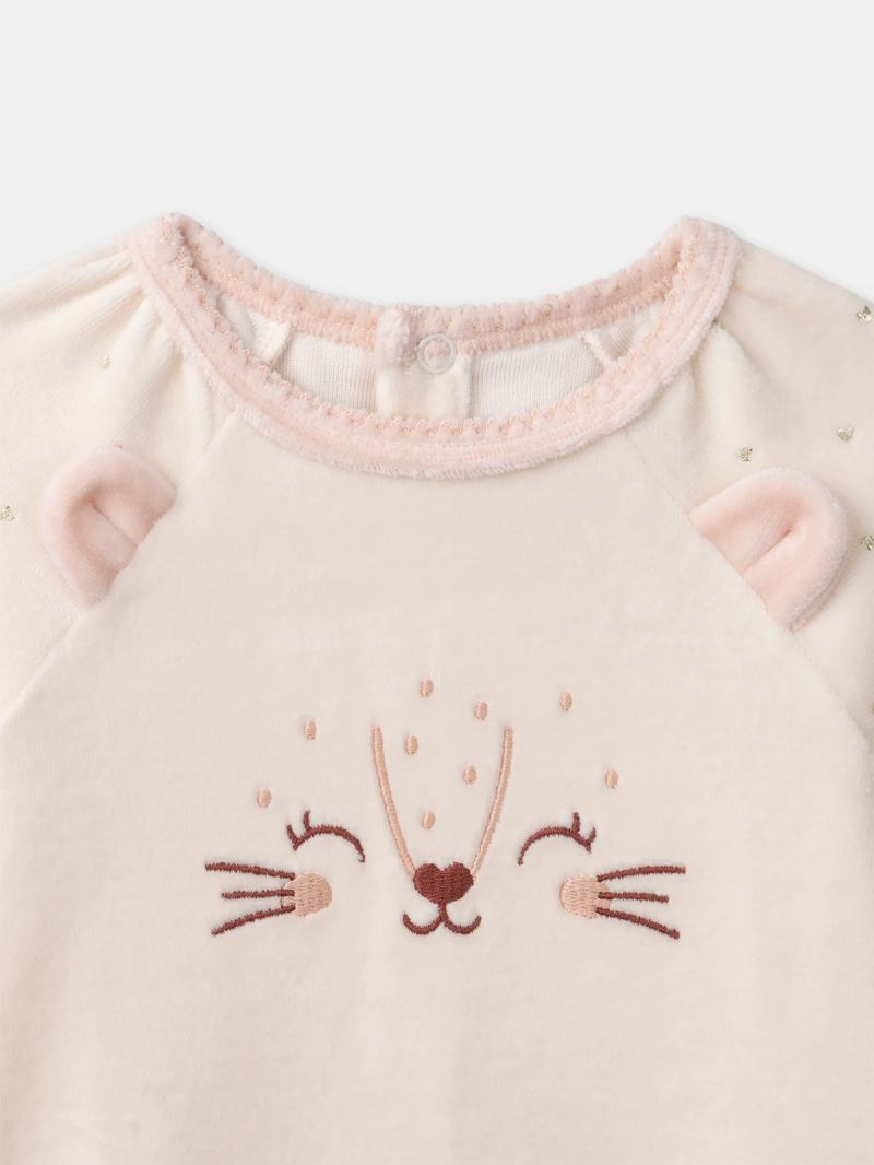 • Декориран е с 3D ушички, фина бродерия и се предлага в комплект с пухкаво плюшено котенце.