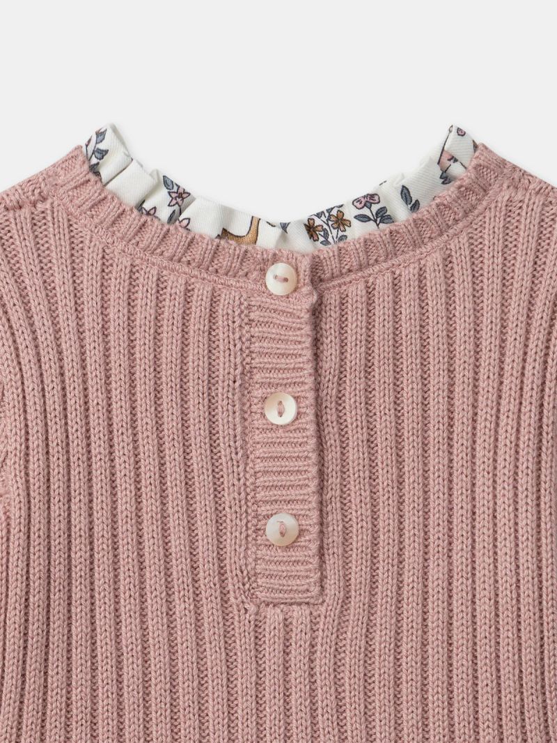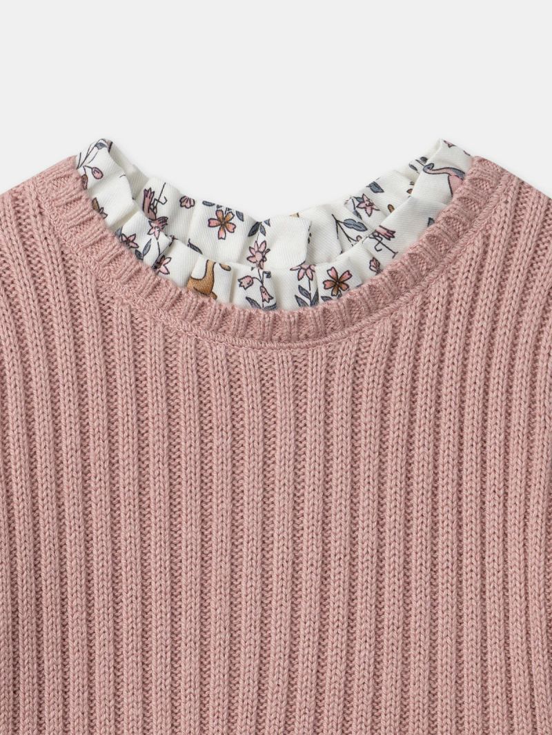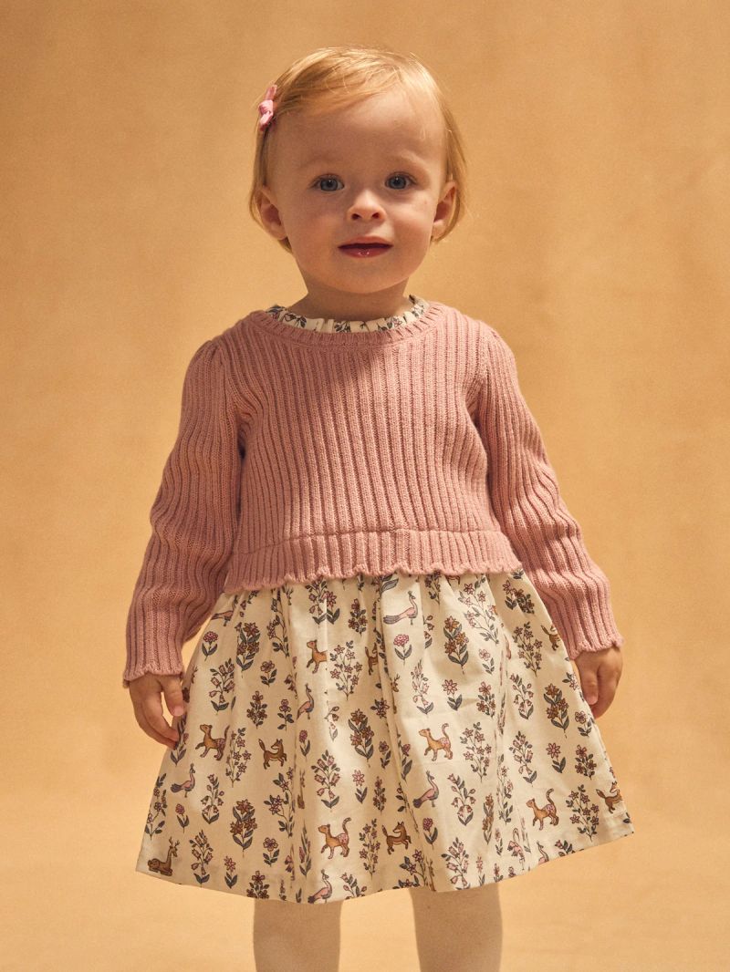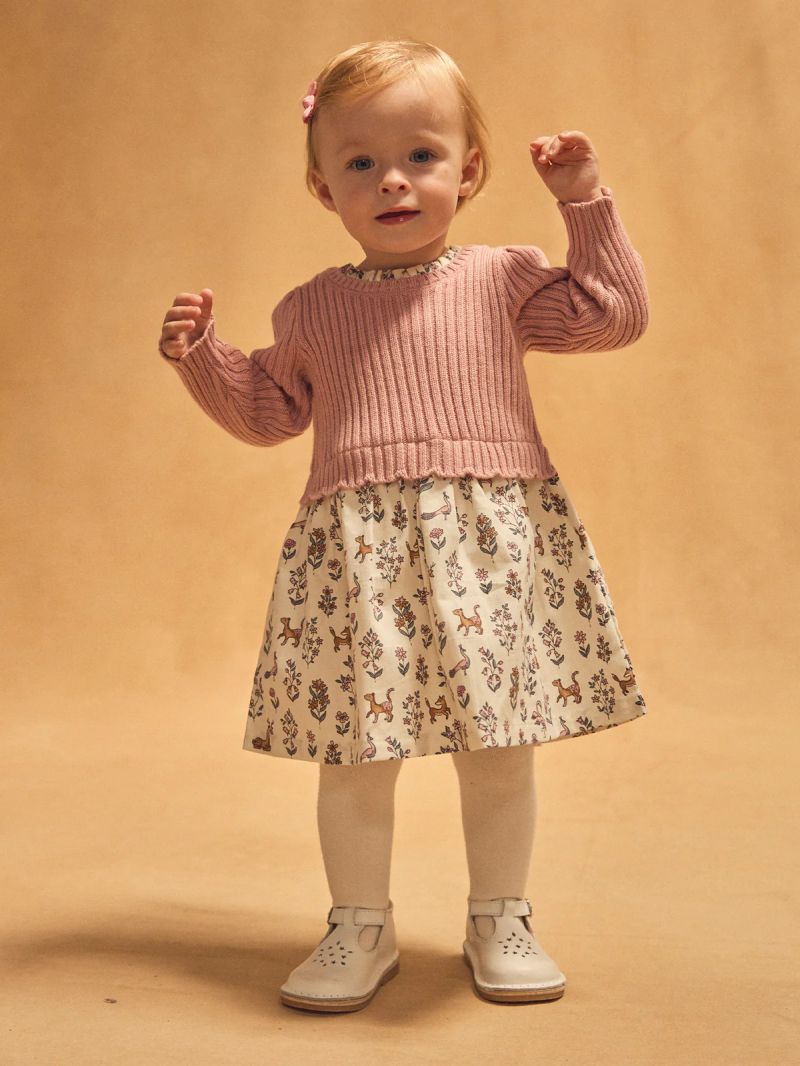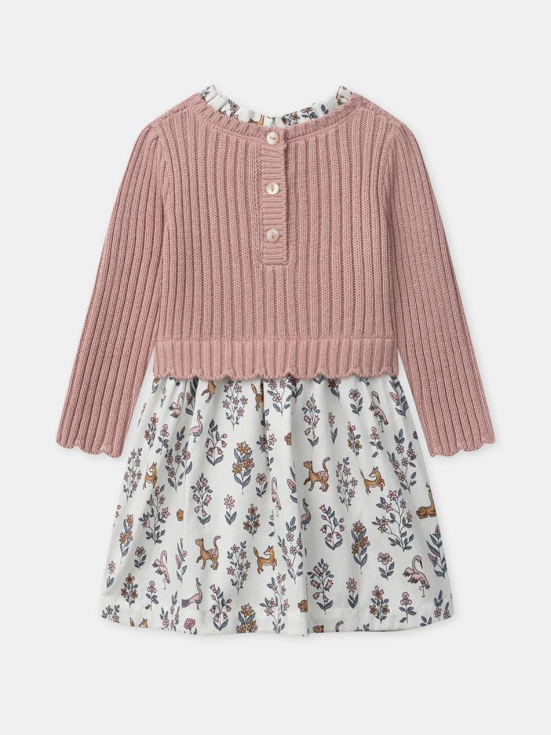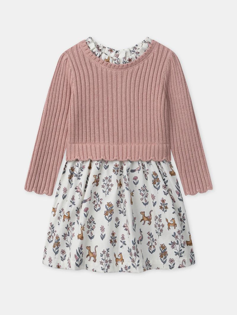 Тази рокля е елегантен зимен избор за деца. С плетена горна част и принтирана долна част, тя се закопчава с копчета на гърба. Животинските и флоралните мотиви добавят закачливост и визуална топлина.