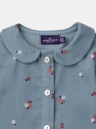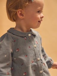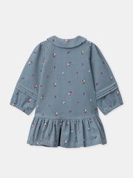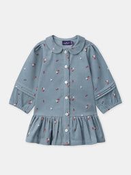 За малките зимни кокетки тази рокля е идеален избор за семейни разходки. Изработена от памук с флорален принт, тя се закопчава с копчета отпред. Яката щ и набраните ръкави носят усещане за класическа изисканост.
