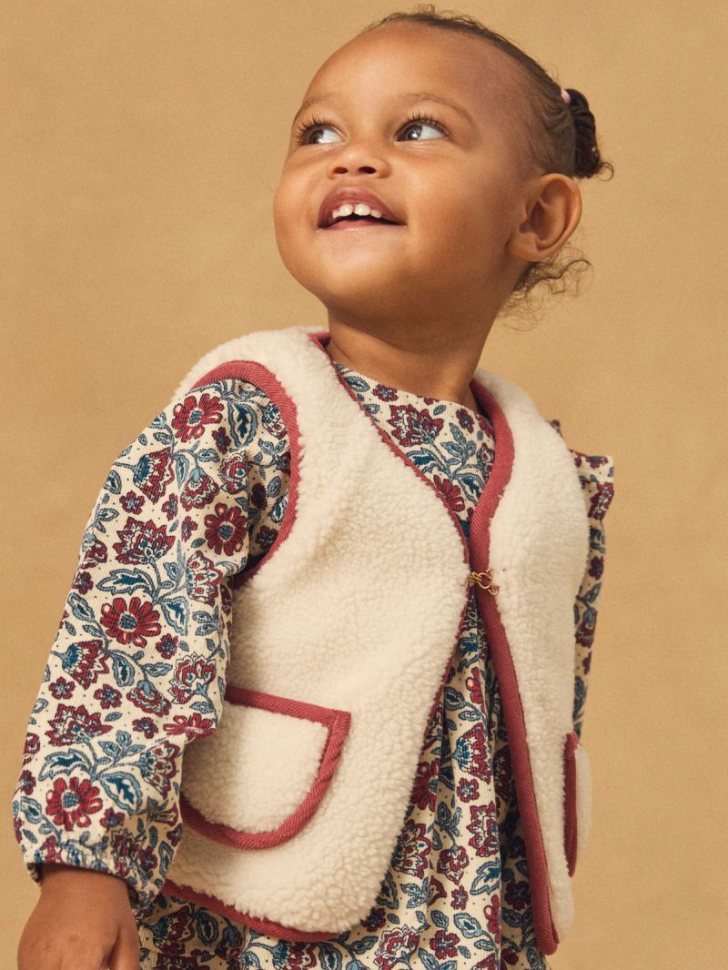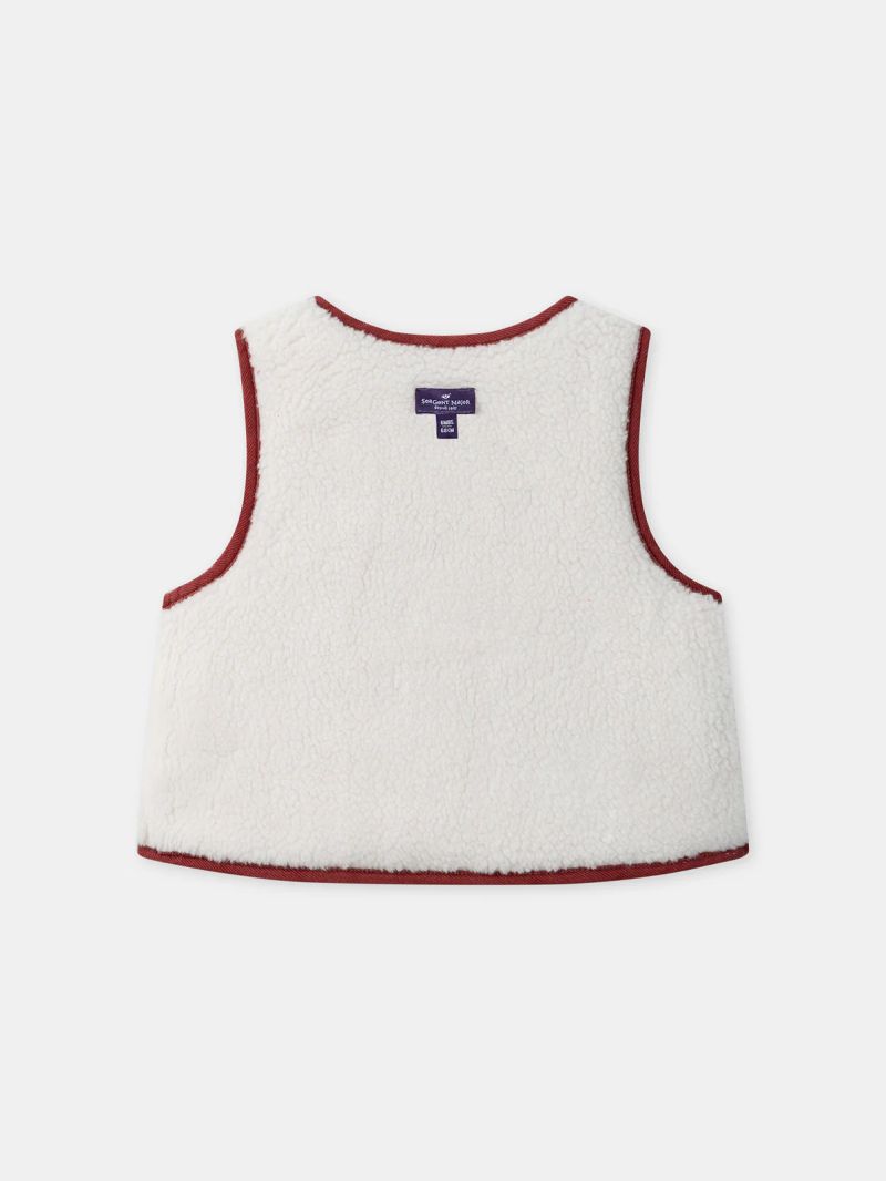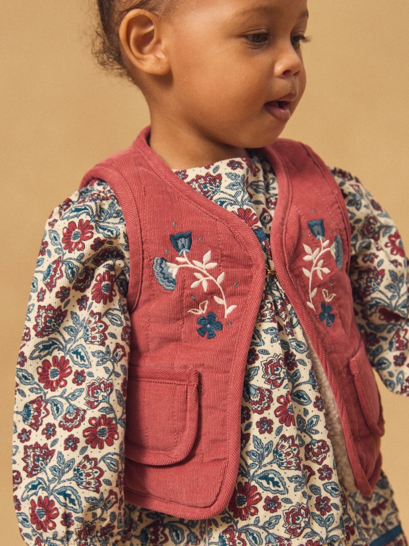 Този елек е създаден за зимата и помага на децата да стоят топли. Той е двулицев, което означава, че може да се носи по два различни начина. Има малки цветни бродерии и контрастни кантове, които го правят още по-сладък.