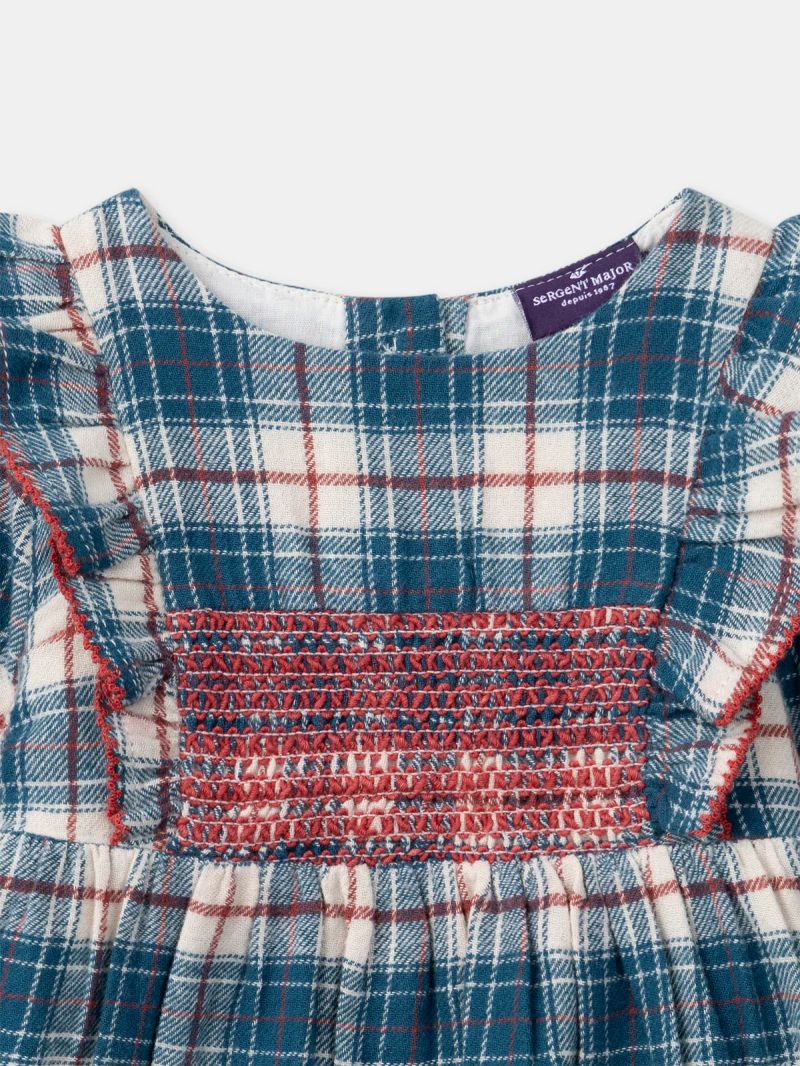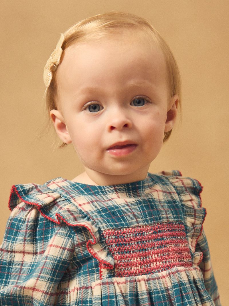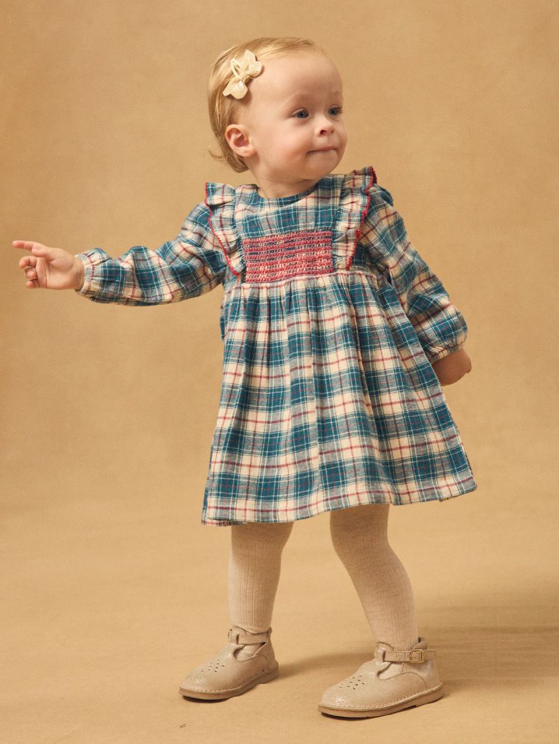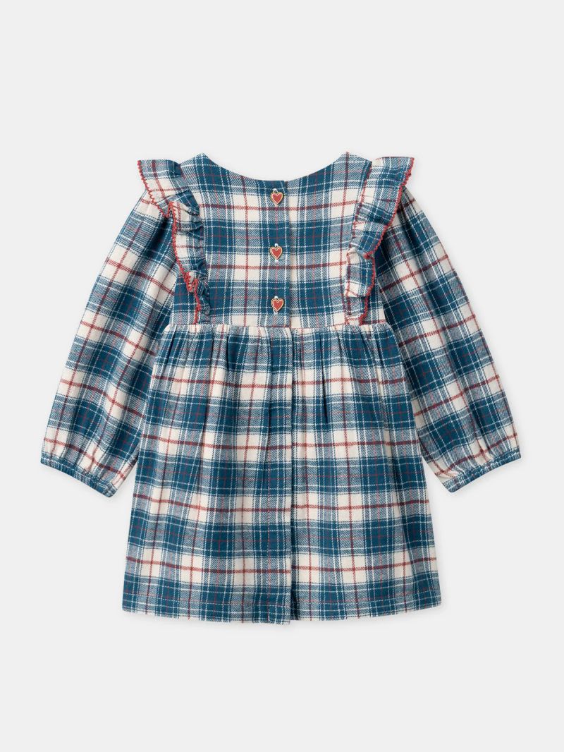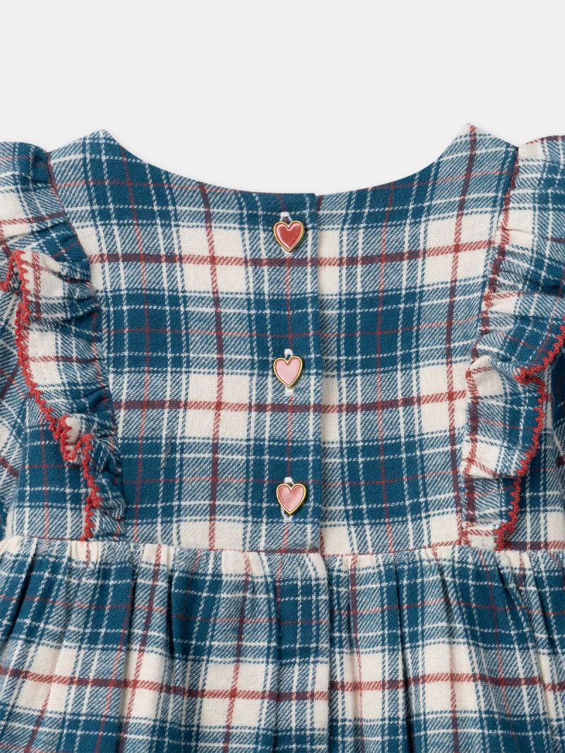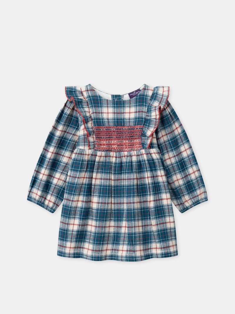 Тази рокля е идеална за зимата и облича малките момичета с елегантност. Карето и меката подплата осигуряват удобство, а наборите и воланите ѝ придават нежен и празничен вид.