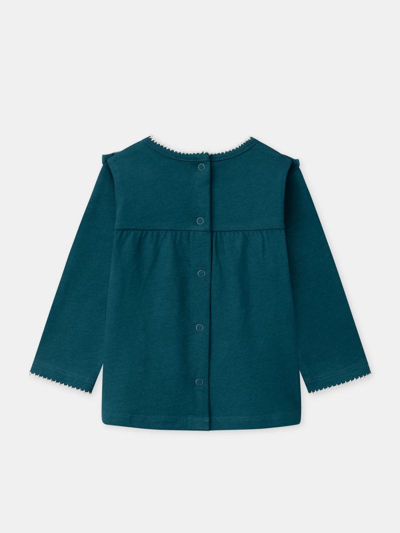 Тази блуза с дълъг ръкав е идеална за по-хладни дни и може лесно да се носи под жилетка или пуловер. Мекият трикотаж е удобен, а фината бродерия и малките къдрици добавят нежност.