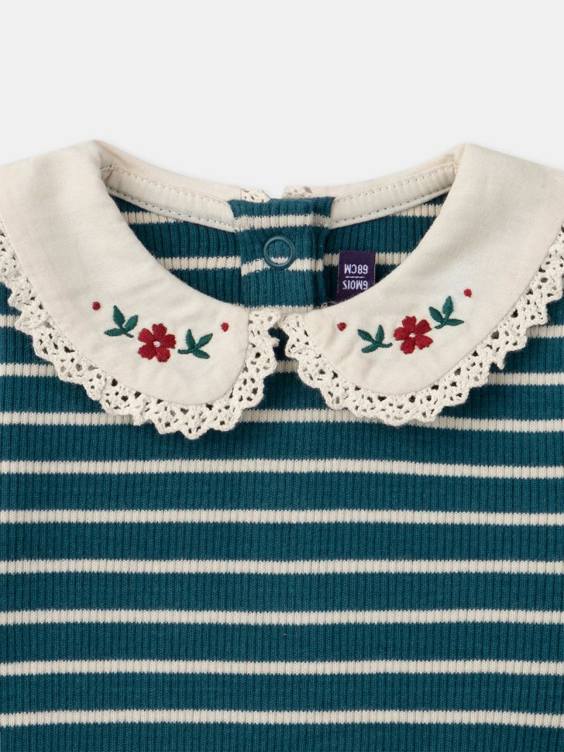 Райетата и закръглената яка с цветна бродерия добавят чар и игривост.