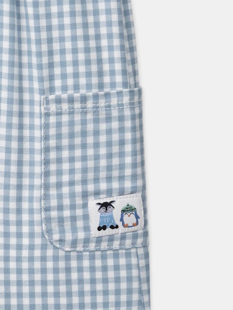 Тези панталони са идеални за зимата и държат детето топло. Изработени са от кариран памук и са подплатени с пухкава материя. Практичната ластична талия осигурява удобство, а джобовете с животинска бродерия добавят закачлив детайл.