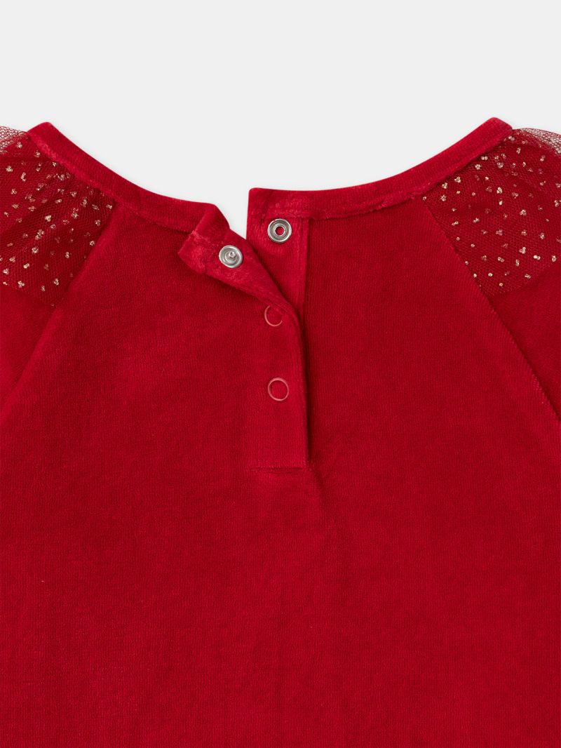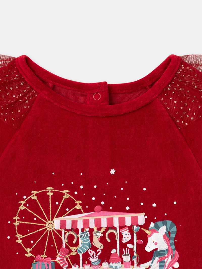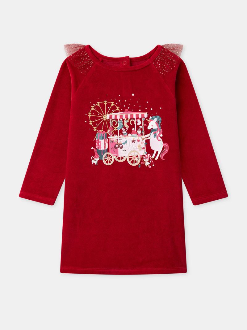 Създадена за малки мечтателки, тази нощница е идеална за зимните празници. Изработена е от мек кадифен плат и идва с удобни клинове в тон, което осигурява топлина и комфорт през студените вечери. Блестящите волани и приказният еднорог с ефектен отблясък добавят вълшебство към всяка коледна нощ.