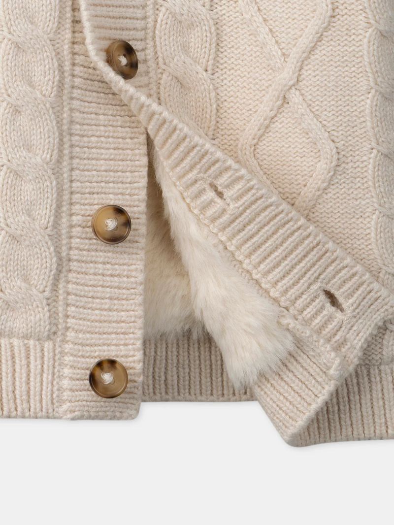 Тази жилетка е топла и удобна, благодарение на меката плетка и пухкавата подплата отвътре. Яката и копчетата отпред придават по-изискан и подреден вид — идеална за по-хладните дни.