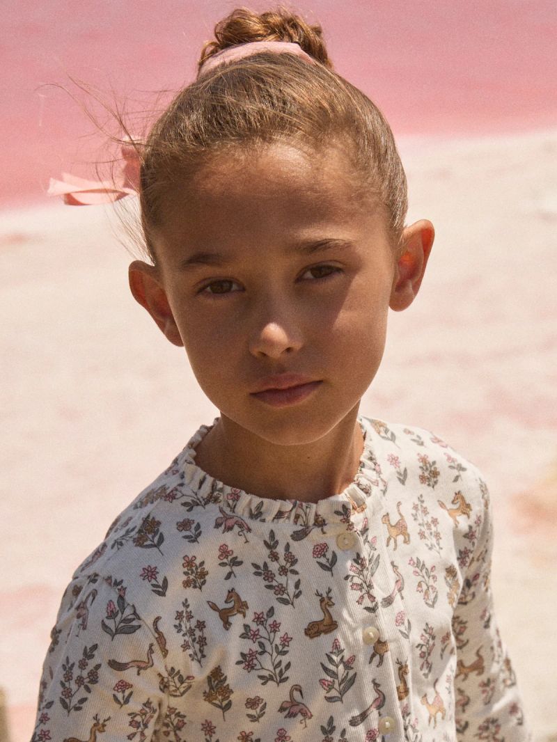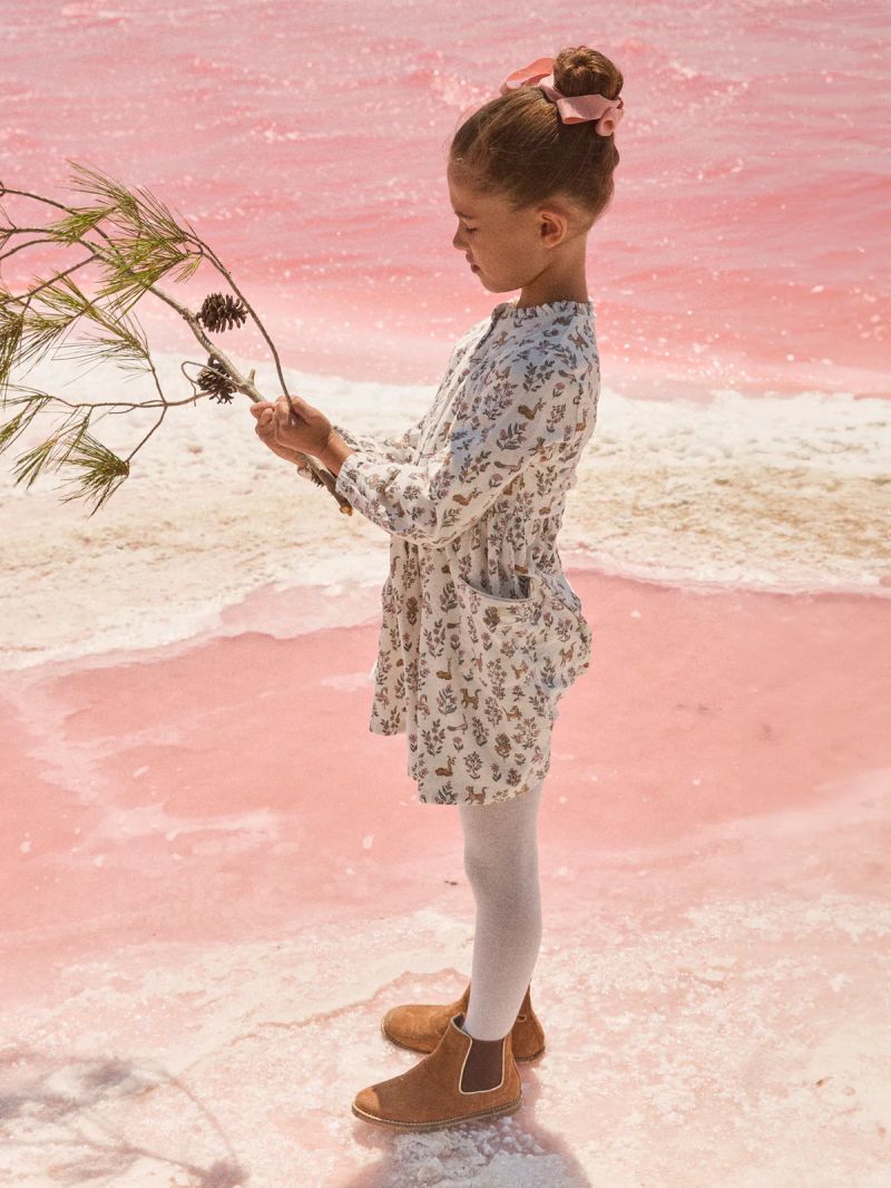 Тази рокля е създадена за малки зимни мечтателки и съчетава елегантност и удобство през студения сезон. Изработена е от мека материя с флорален принт и подплатена с памук за допълнителен комфорт. Практичното закопчаване с копчета отпред улеснява обличането. Яката с волан, наборите и джобовете добавят фин, нежен акцент.