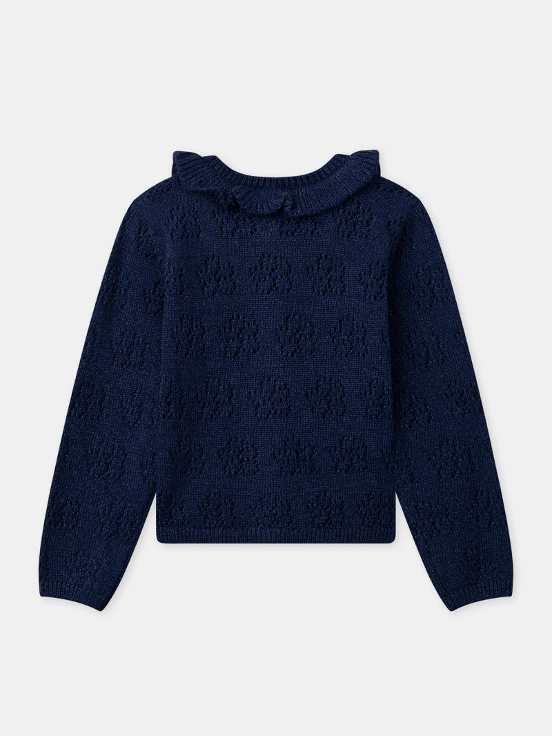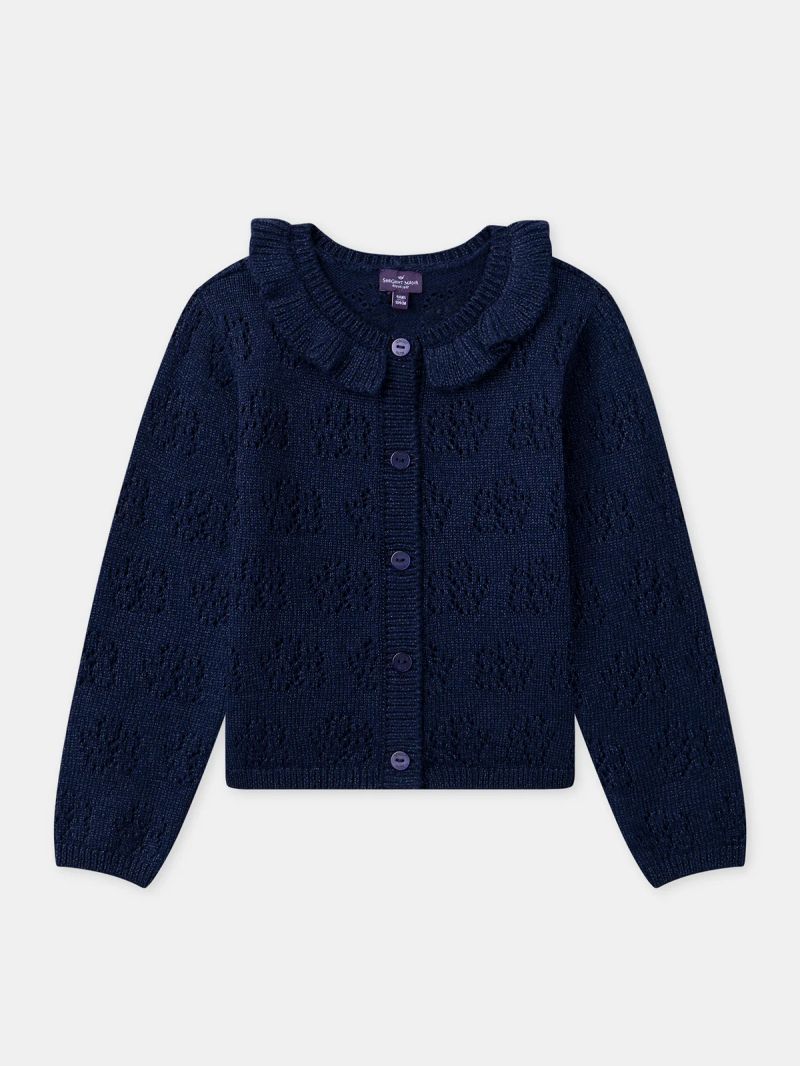 Тази жилетка е идеална за момичета, които обичат елегантния стил през зимата. Лесно се носи върху тишърт и е изработена от ажурна плетена материя с метализирани нишки, което я прави мека, удобна и ефектна. Яката с волан и копчетата отпред добавят фин и изискан завършек.
