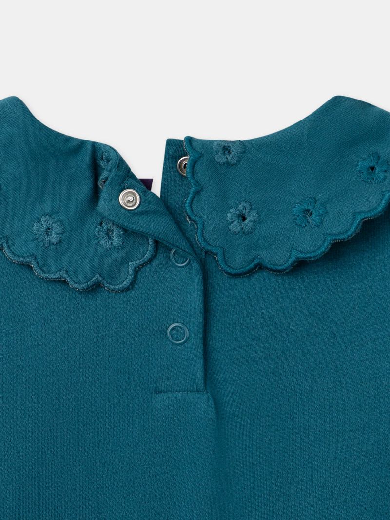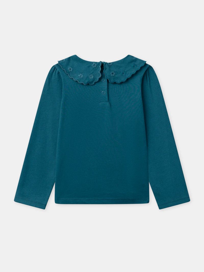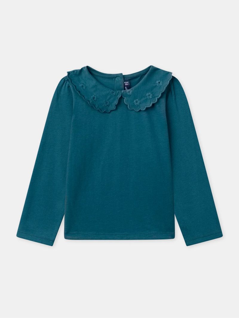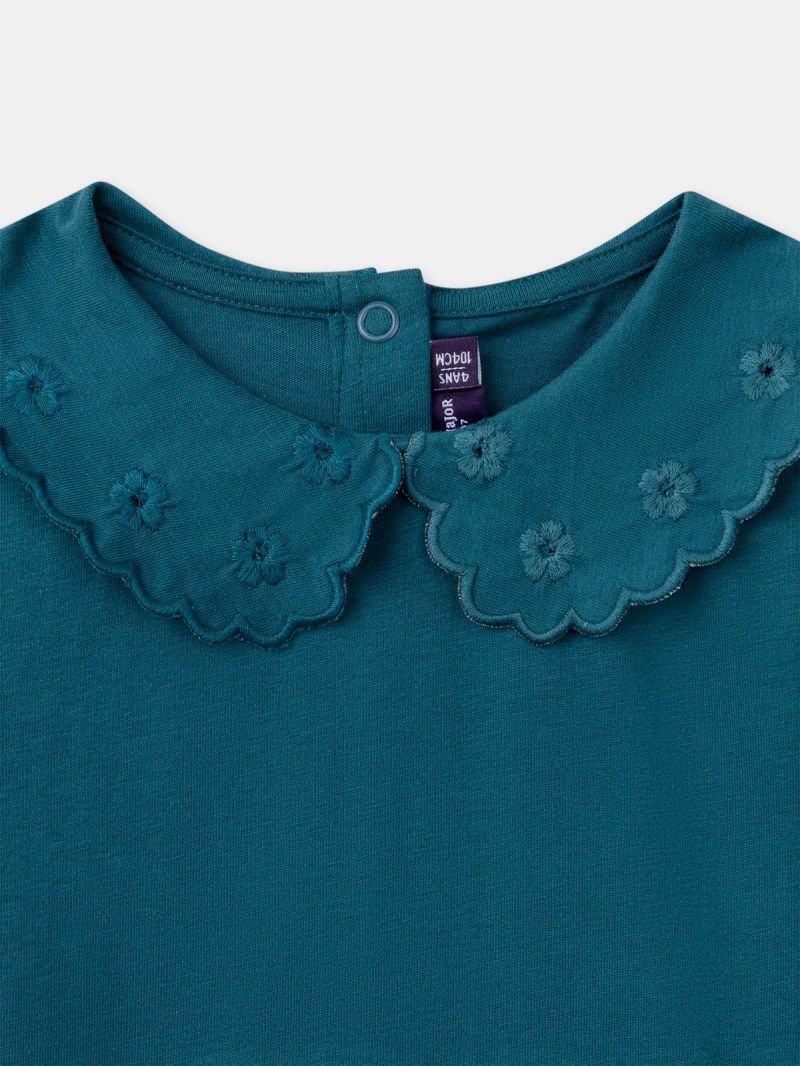 Подходяща за стилни малки момичета, тази блуза е идеална за преходните сезони или за носене под жилетка. Изработена от меко, приятно на допир жарсе, тя осигурява комфорт през целия ден. Декоративната дантелена яка и копчетата отзад придават фин и изискан вид.