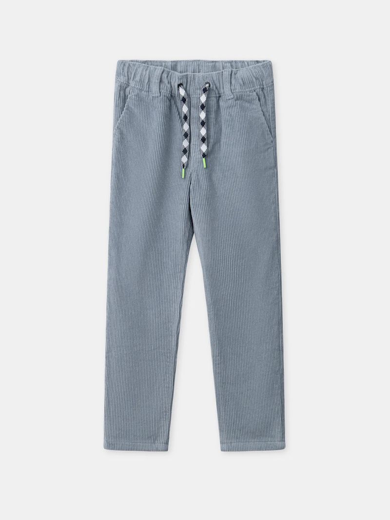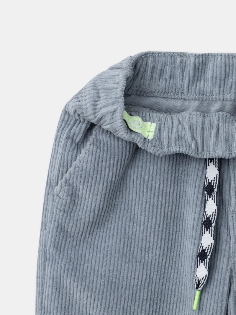 Тези панталони са идеални за уютна зима и безгрижна игра. Изработени са от меко кадифе с подплата от трико, а ластичната талия с връзка осигурява отлично прилягане. Джобовете и синьо-сивият цвят придават нежен и ежедневен вид.