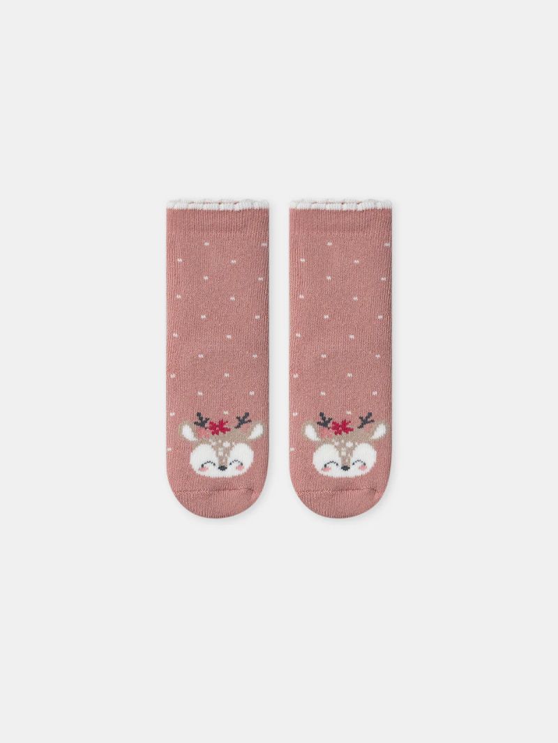 Тези чорапки поддържат малките крачета топли през зимата. Изработени от меко плетиво с фин завършек, те са удобни и приятни за носене. Мотивът на еленче в розово и малките точици в екрю носят усещане за зимна приказка.