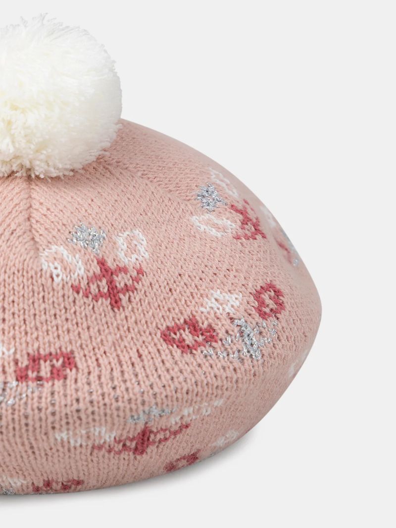 Розова зимна шапка с помпон и цветни мотиви за момиче
