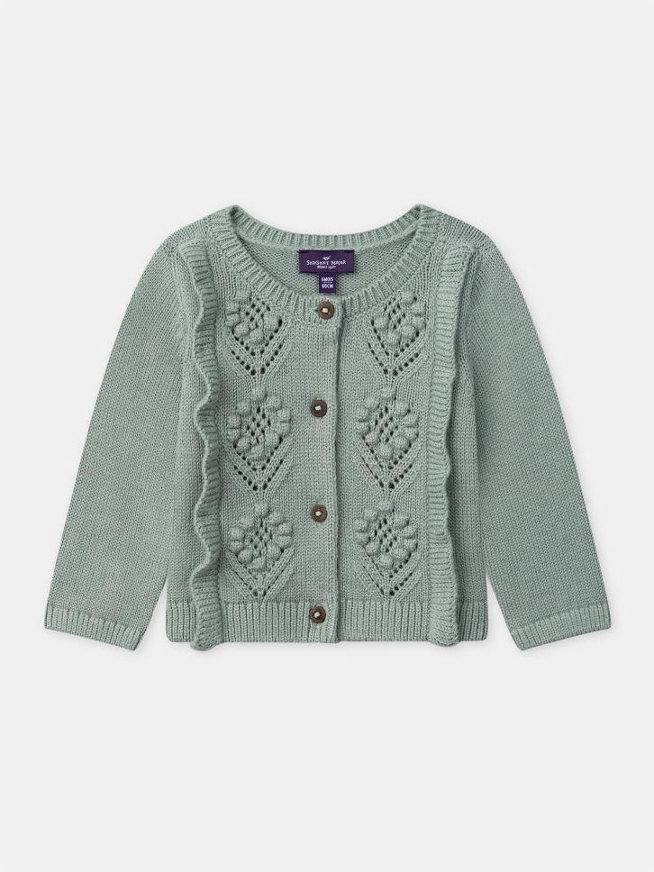 Ажурната плетка и закопчаването с копчета придават лекота и удобство. Къдрите добавят нежен и изискан акцент.
