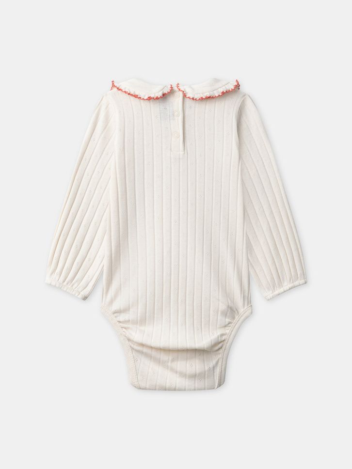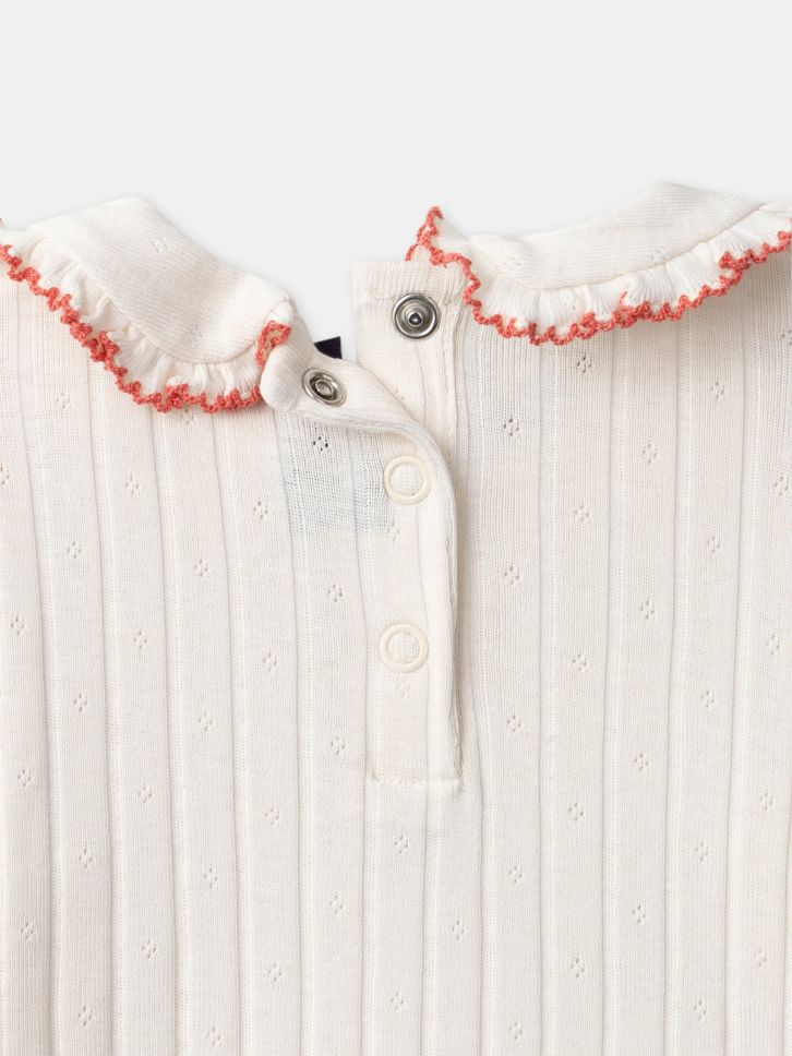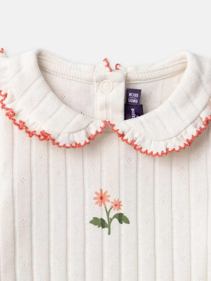 Рипсеното памучно трико и тик-так копчетата правят обличането лесно и удобно. Малките цветя добавят усещане за нежност и мекота.