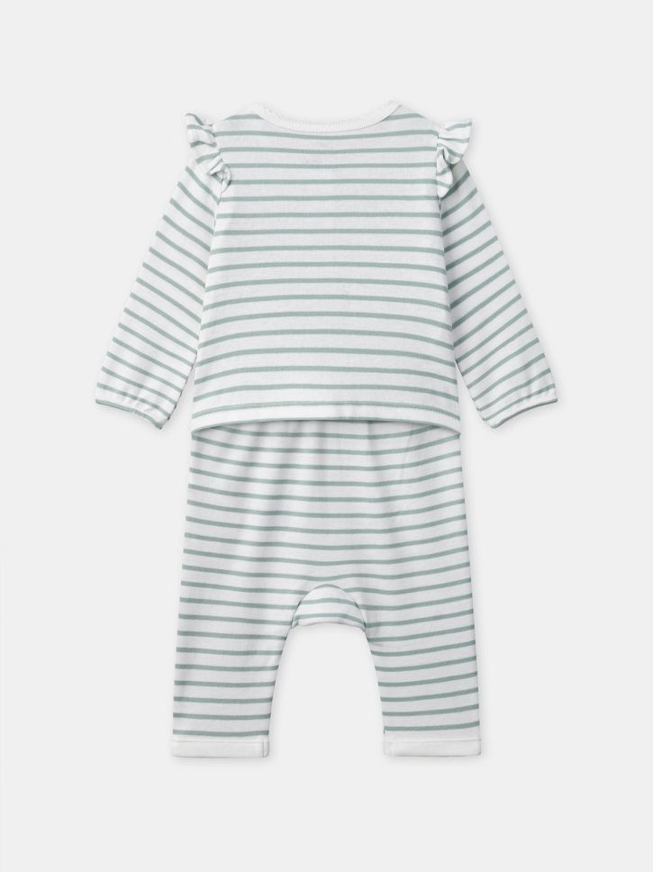 Био памукът без притискане и отворът на гърба осигуряват комфорт и удобство. Райетата в цвят салвия, бродерията с патица и къдрите придават нежен и изискан стил.