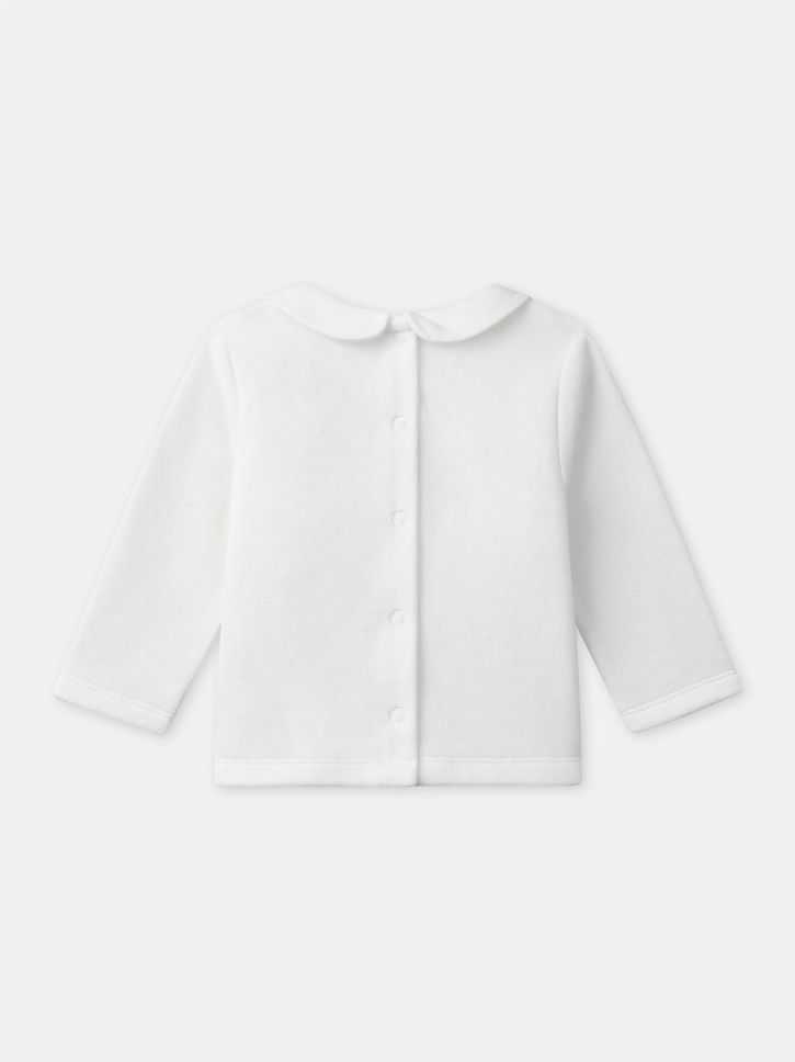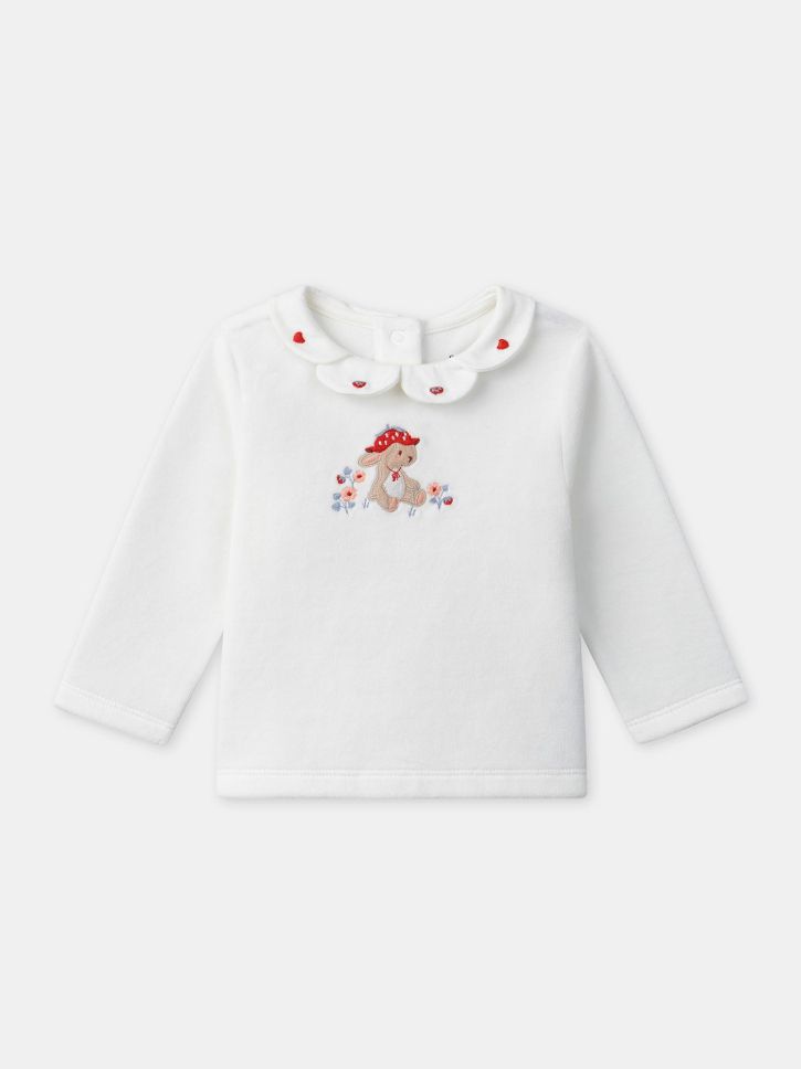 Екрю кадифено горнище с яка във форма на цветни венчелистчета, бродирана със сърчица и ягодки