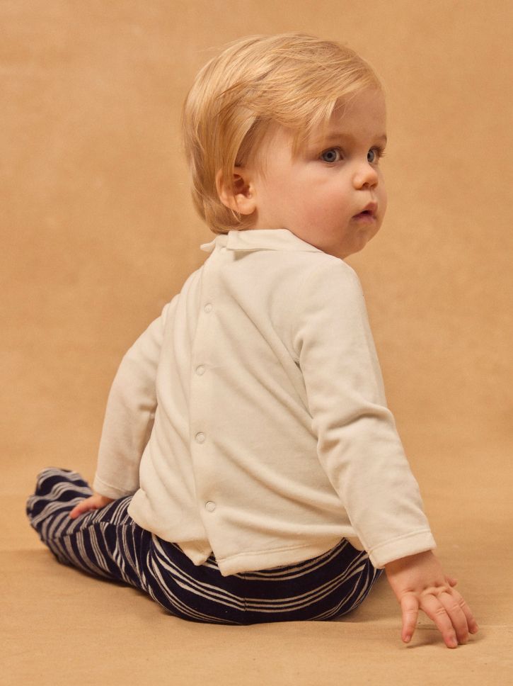 Горната и долната част могат да се прикрепят една към друга чрез вътрешна система от тик-так копчета. Пижамата е изработена от органичен памук и съдържа минимум 20% рециклирани влакна."