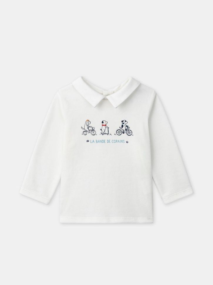 Принт с малки кученца на гърдите и надпис „La bande de copains“ („Бандата приятели“) в нюанси на тъмносиньо и небесносиньо с акценти в кафяво и червено