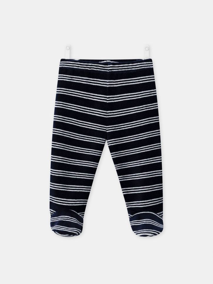 Тъмносин кадифен панталон с екрю райета