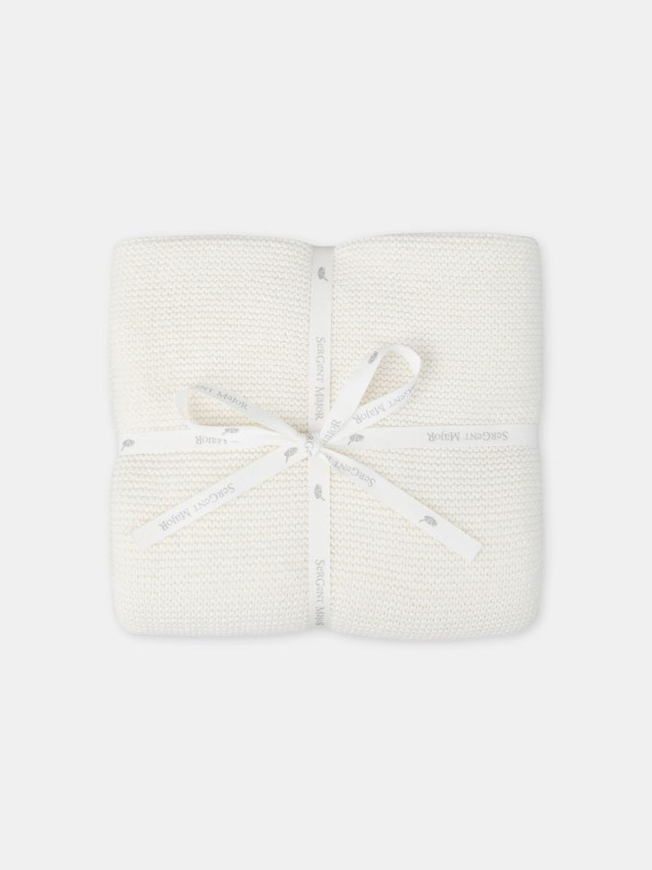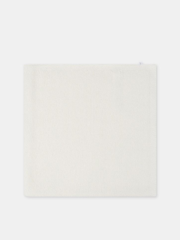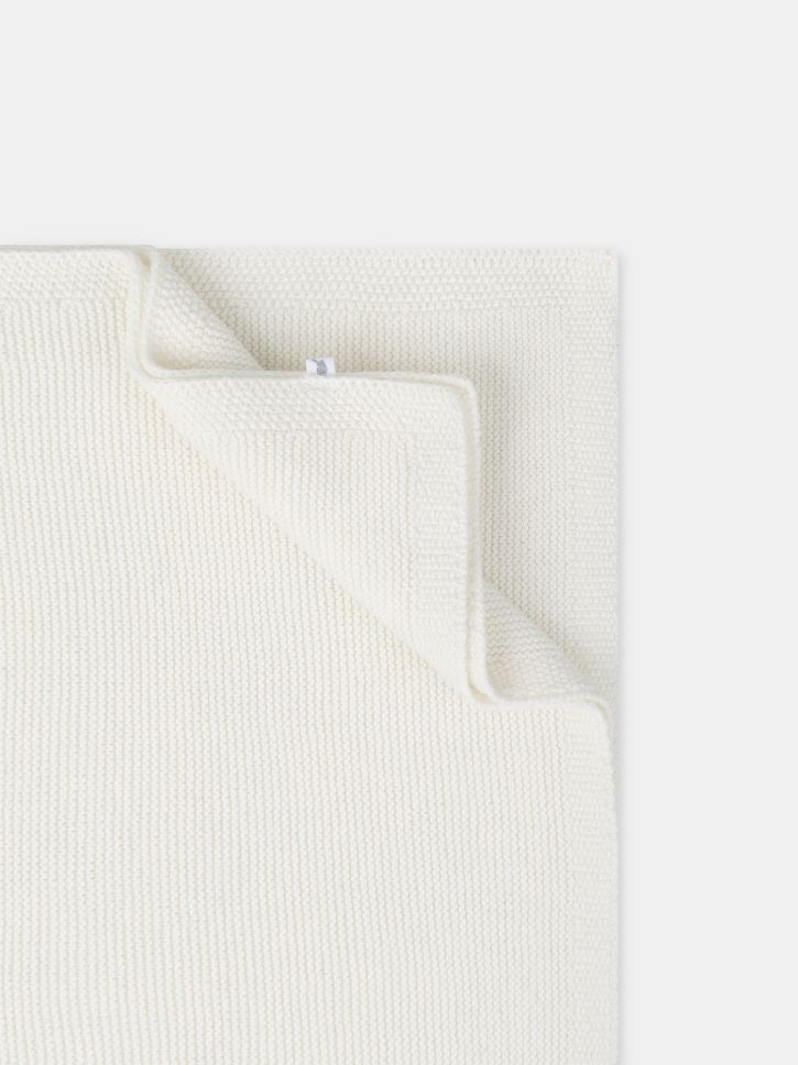 Одеяло от памук и вълна с жартиерна плетка по краищата. Мек екрю цвят с уютна и естествена визия.