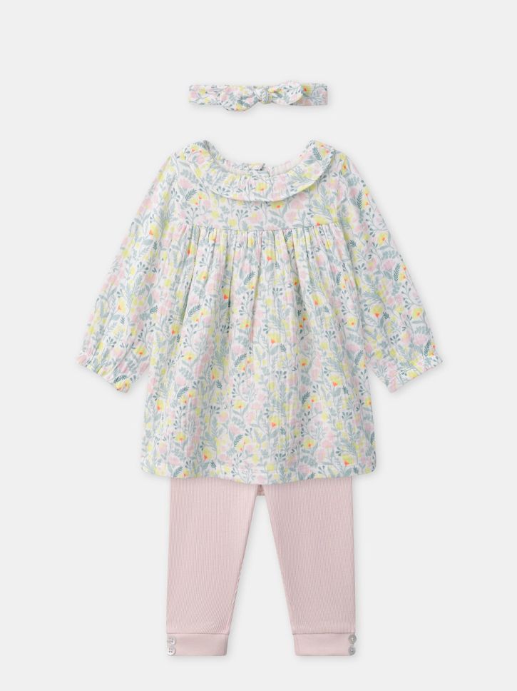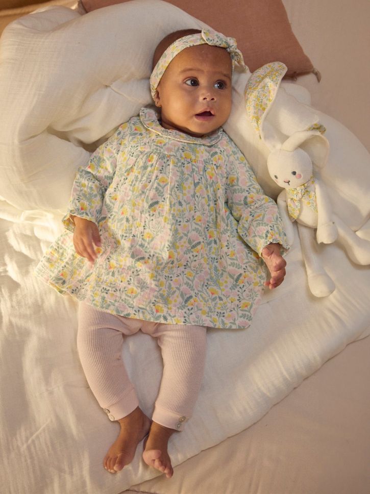 Комплект от рокля от лек памучен плат и рипс клин, с копчета на гърба. Флорален принт и съответстваща лента за глава за поетична и нежна визия.
