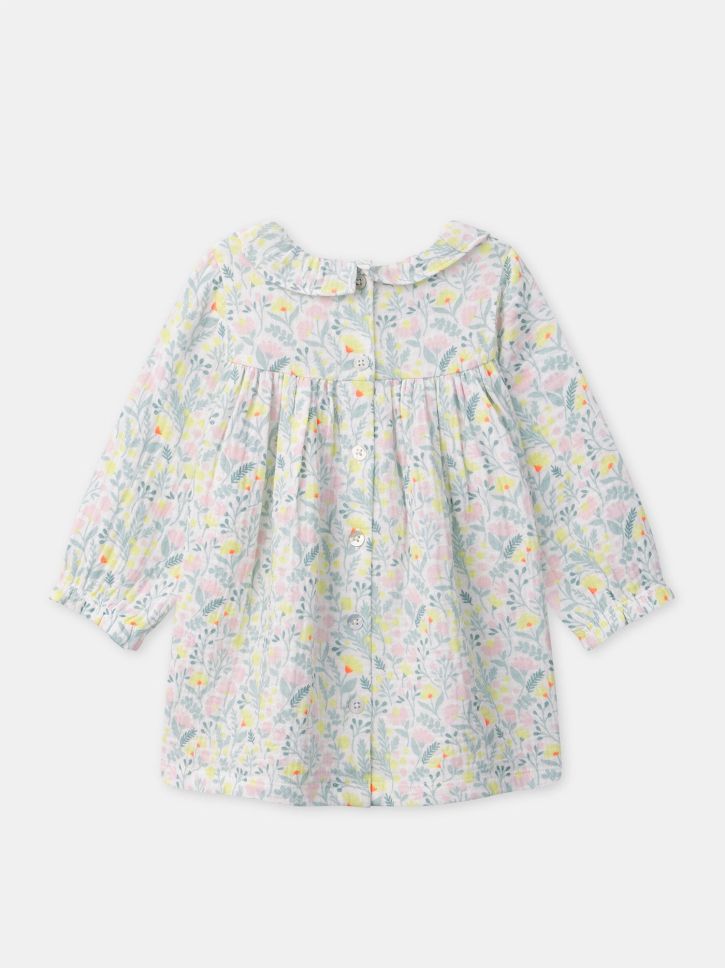 Рокля от памучен плат с флорален принт в нюанси на бледо розово, мимозено жълто, нежно зелено и фини неоново-коралови акценти върху екрю фон