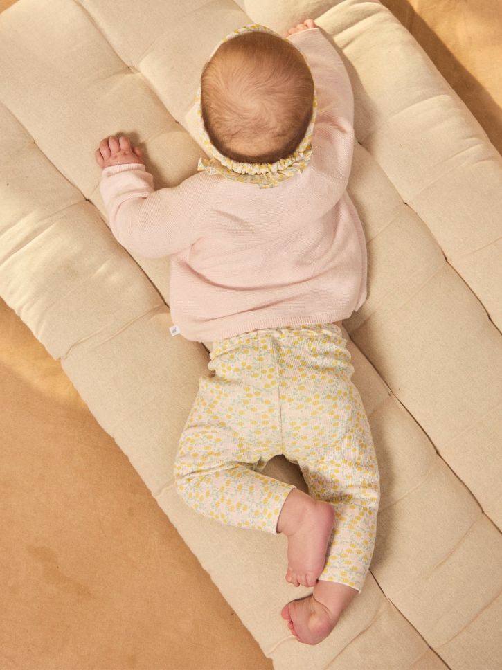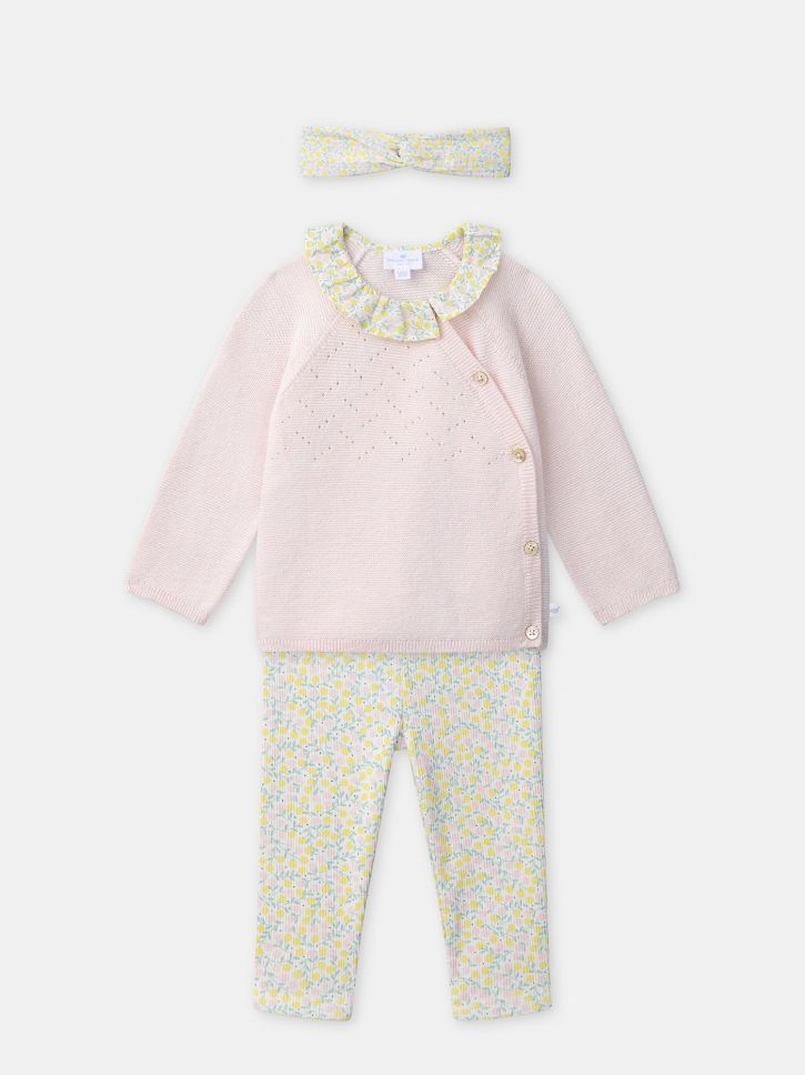 РОЗОВ ПУЛОВЕР + ФЛОРАЛЕН КЛИН + ЛЕНТА ЗА КОСА С ФЛОРАЛЕН МОТИВ – КОМПЛЕКТ ЗА НОВОРОДЕНО МОМИЧЕ