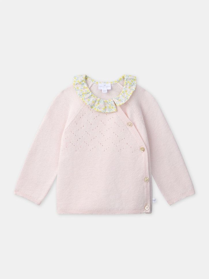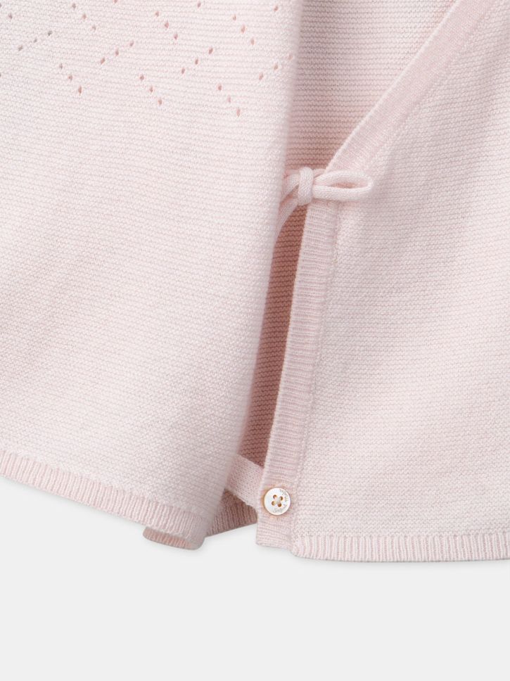 Светлорозов плетен пуловер от памук и вълна с прехлупено закопчаване