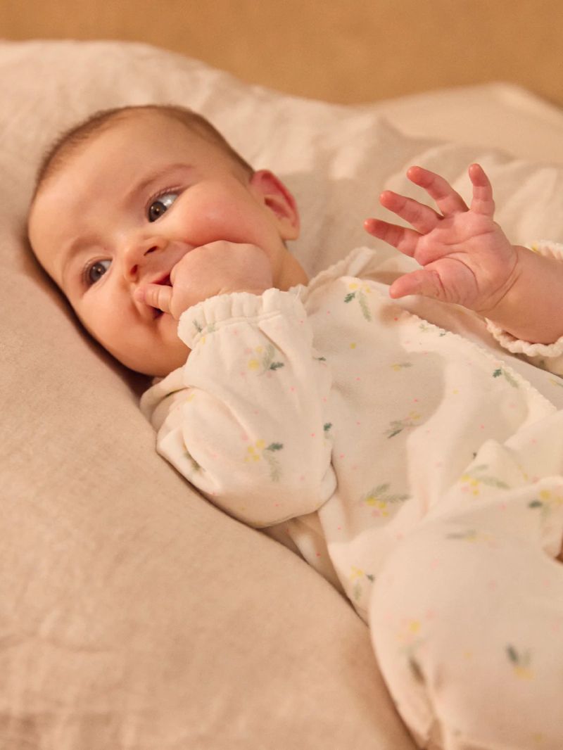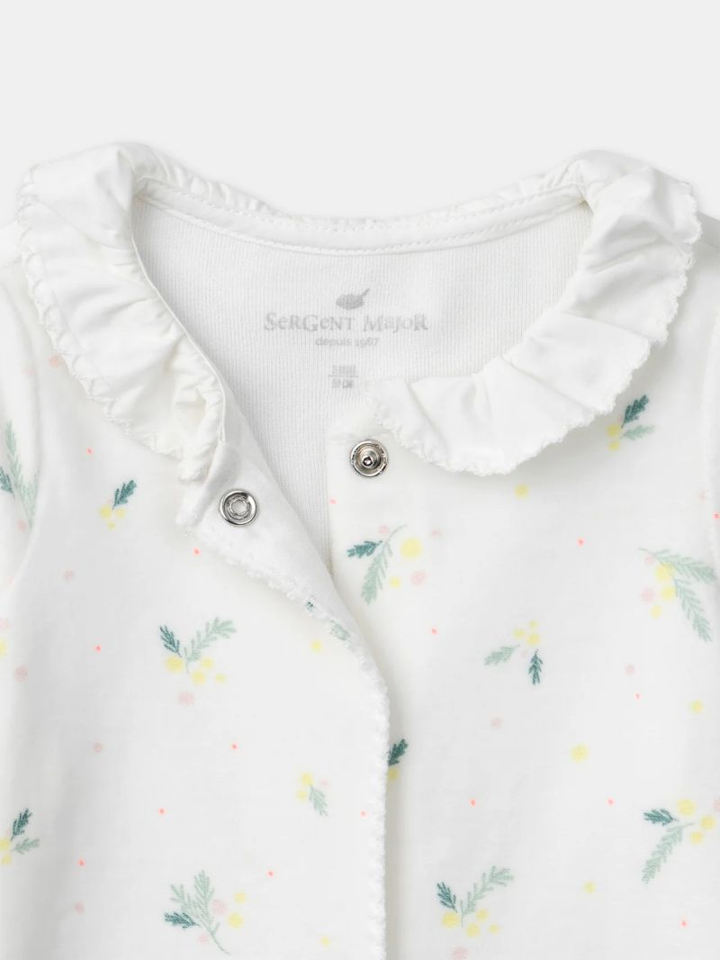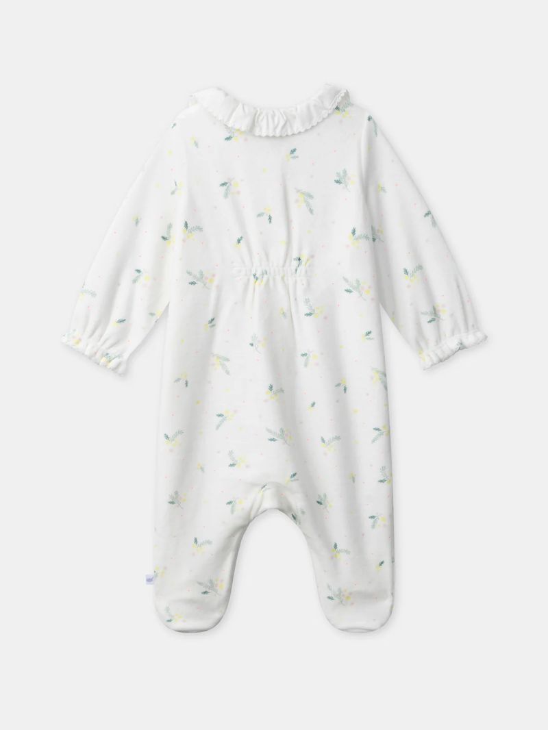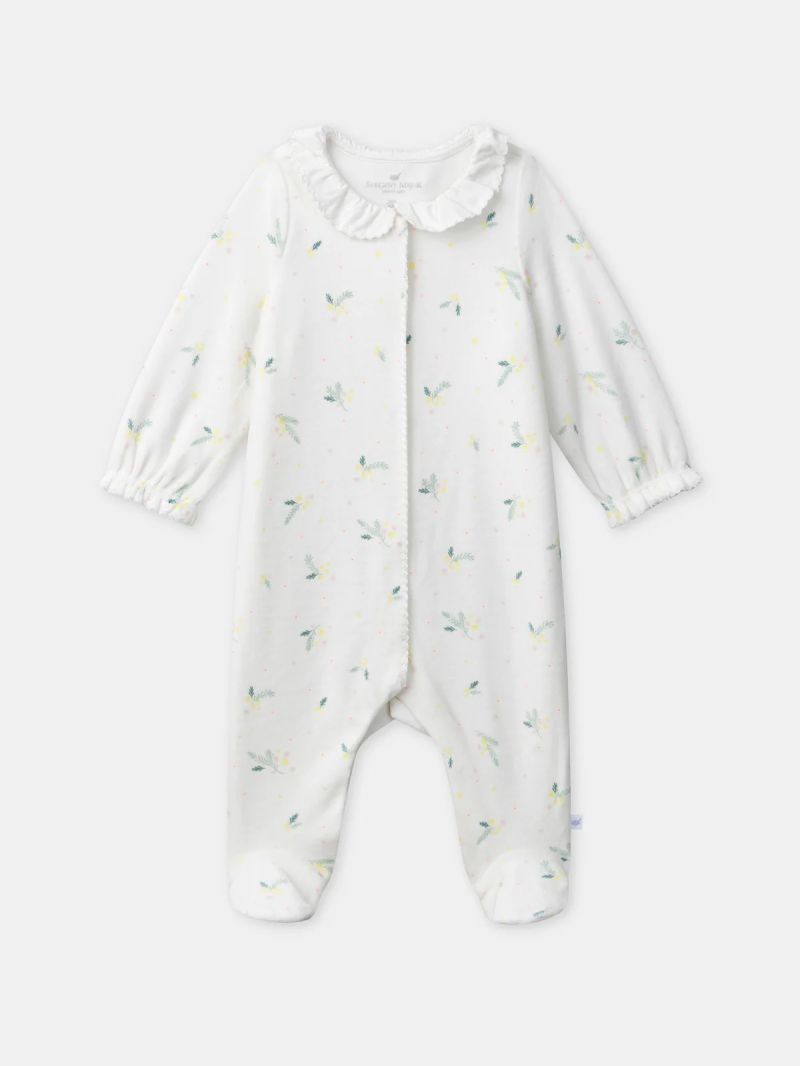 Създаден за любопитните малки откривателки още от първите дни – перфектен за пролетта. Меката кадифена материя с органичен памук осигурява комфорт, а флоралният принт придава нежен и естествен стил. Декориран с клонки от листа и цветя в нюанси на бледо розово, мимоза жълто, меко зелено и фини неоново коралови акценти върху екрю фон. Детайли: Обло деколте с яка в екрю цвят и фино декоративно завършване Декоративен кант по предната линия Леко набрани еластични ръкави с фино завършване Скрити тик-так копчета отпред и при крачолите за лесно обличане Съдържа памук от биологично земеделие и минимум 20% рециклирани влакна